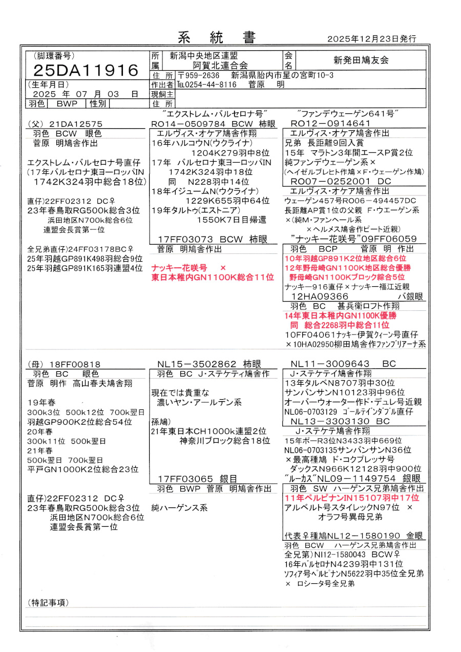 出品鳩「25DA11916 BWP」菅原 明鳩舎作 23年連盟会長賞獲得鳩(RG500K総合3位地区N700K総合6位) の全兄弟鳩で エクストレム・バルセロナ号バルセロナN1742K14位の直仔×平戸GN1000k総合23位鳩 との直仔です。 父親「21DA12575 BCW」菅原 明鳩舎作 直仔 23年連盟会長賞獲得鳩がいる エクストレム・バルセロナ号バルセロナN1742K14位ハルコウN1204K8位イジュームn1229K64位たる等1550K7日目帰還鳩×(ナッキー花咲号×東日本GN総合11位)娘鳩 との直仔です。 母親「18FF00818 BC」菅原 明鳩舎作 高山春男鳩舎翔 平戸GN1000k総合23位羽越GP900K総合54位鳩で 直仔に 23年連盟会長賞獲得鳩がいる ステケティ作タルベN30位サクバンサンN96位の直仔×純ハーゲンス系ルーカス号の娘鳩 との直仔です。 詳しくは、添付の血統書を参照してください。 <備考> 現在管理人の鳩舎で元気に過ごしています。写真は12/23日に撮影しました。 菅原明鳩舎の概要はこちらをご覧ください |