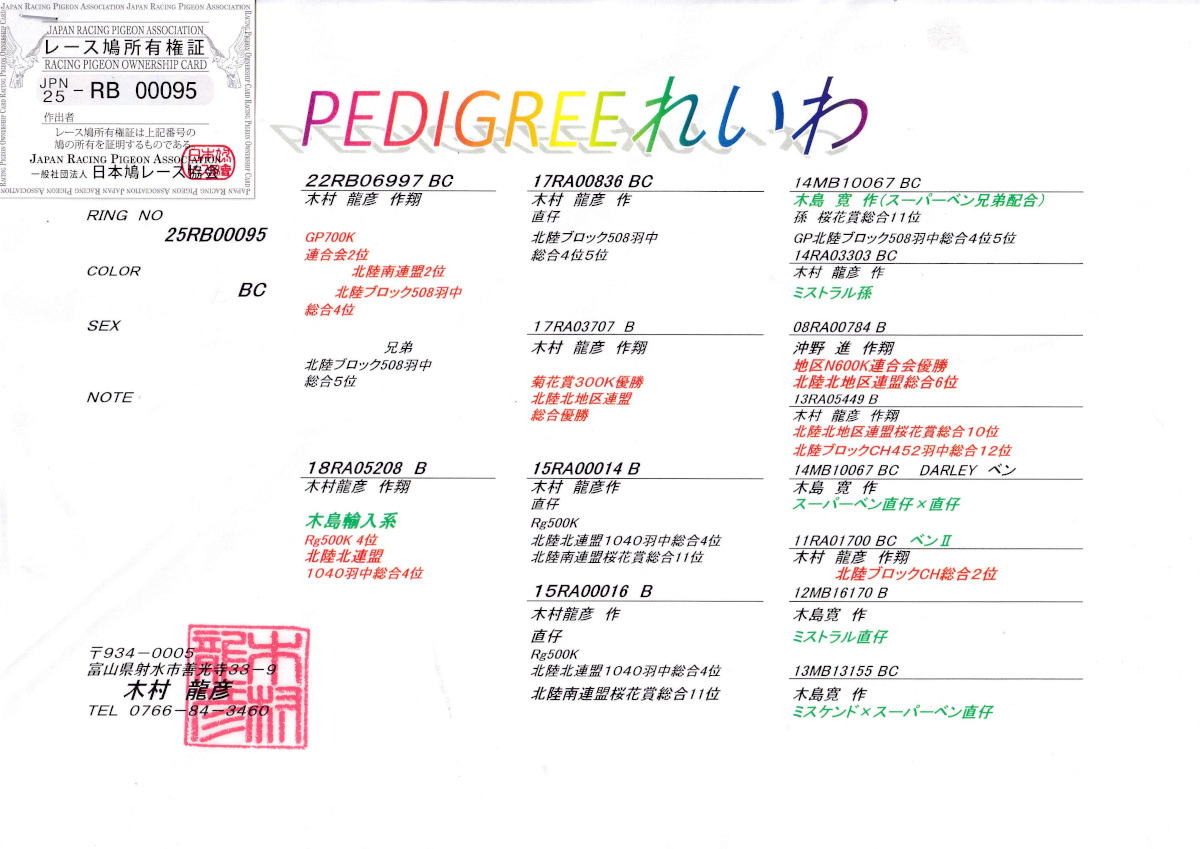 出品鳩「25RB00095 BC」木村龍彦鳩舎作 木島輸入系スーパーベン&ミストラル号ライン鳩 GP700K連盟2位ブロック総合508羽総合4位×RG500K1040羽総合4位鳩 との直仔です。 父親 「22RB06997 BC」木村龍彦鳩舎作翔 GP700K連盟2位ブロック総合508羽総合4位 兄弟も同GP総合5位鳩がいる 木島鳩舎スーパーベン&ミストラル号ライン鳩×菊花賞300K総合優勝鳩 との直仔です。 母親 「18RA05208 B」木村龍彦鳩舎作翔 RG500K1040羽総合4位鳩で 純木島輸入系 スーパーベン号近親×ミストラル号孫鳩 との直仔です。 詳しくは、血統書を参照してください。 <備考> 現在管理人の鳩舎で元気に暮らしています。写真12/21日に撮影しました。 菅原明鳩舎の概要はこちらをご覧ください |
