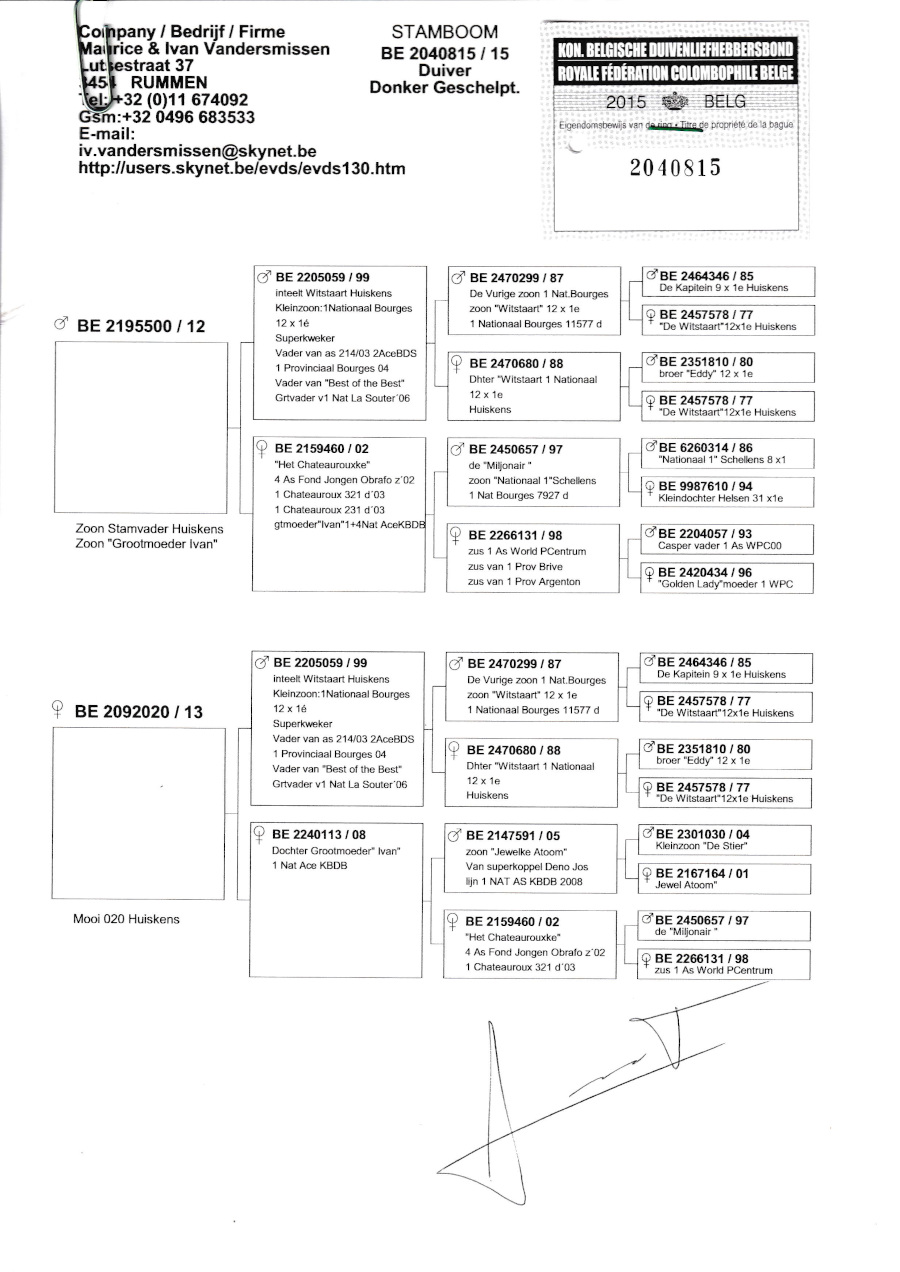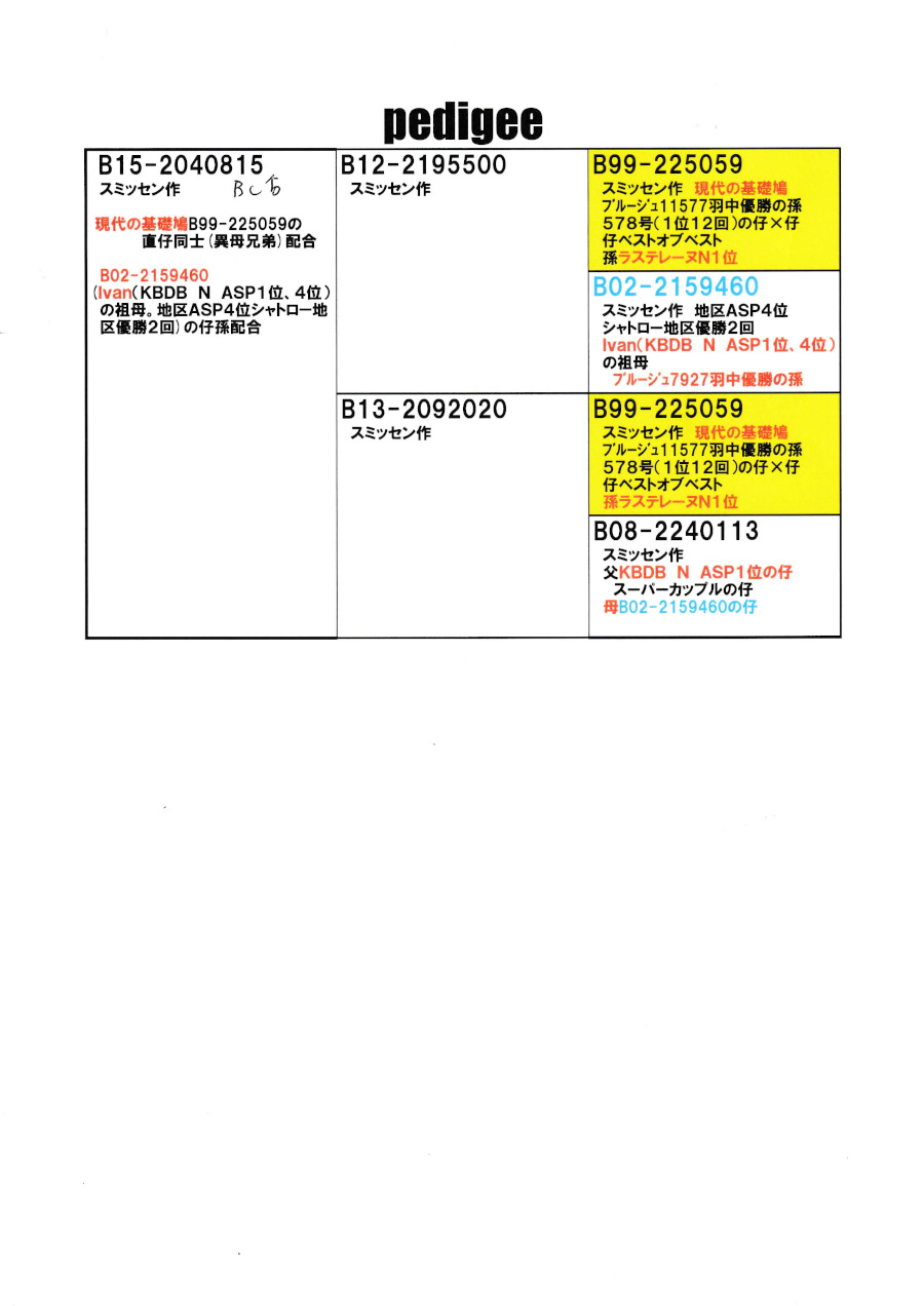 出品鳩「B15−2040815 BC♂」スミッセン鳩舎作現在の基礎鳩(ブールジュ11577羽優勝の孫&ペストオブベストの父親)の直仔×直娘鳩の異母兄弟交配の直仔です。 父親 「B12−2195500」スミッセン鳩舎作 現代の基礎鳩(ブールジュ11577羽優勝の孫&ペストオブベストの父親)×地区エースP4位シャトロー地区優勝2回鳩 との直仔です。 母親 「B13−2092020」スミッセン鳩舎作 現代の基礎鳩(ブールジュ11577羽優勝の孫&ペストオブベストの父親)×KBDBNatエースP1位の孫鳩 との直仔です。 詳しくは、血統書を参照してください。 <備考> 現在管理人の鳩舎で元気に暮らしています。写真12/21日に撮影しました。 菅原明鳩舎の概要はこちらをご覧ください |