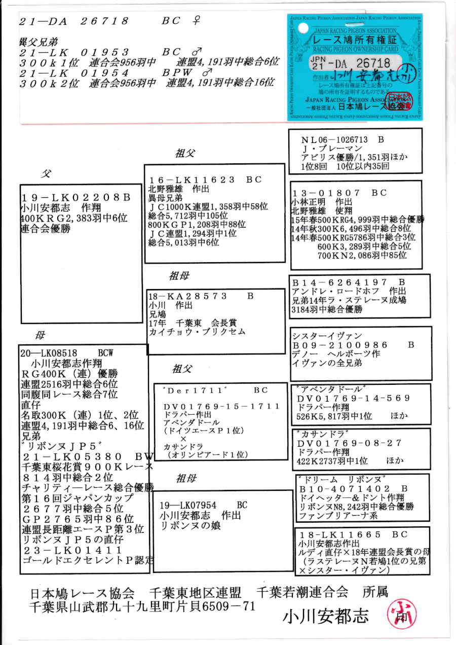 出品鳩リスト外「21DA26718 BC♀」小川安都志作異父兄弟)300K4191羽総合6位16位 RG400K優勝総合6位×RG400k優勝総合6位 ![]() |