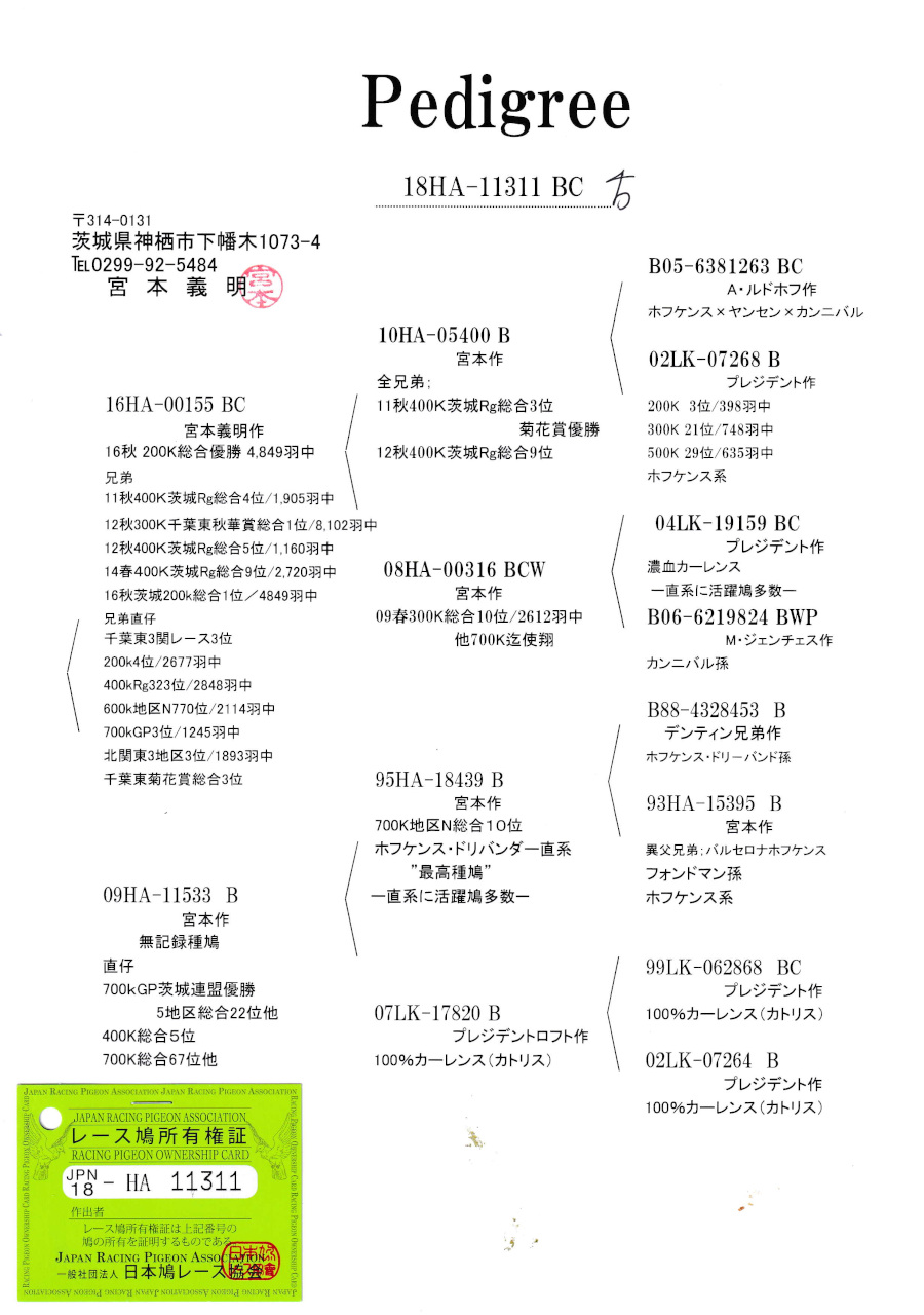 出品鳩「18HA11311 BC♂」宮本義明作半兄弟)秋華賞総合優勝RG総合4位5位鳩GP連盟優勝 秋200K4849羽総合優勝×地区N総合10位の娘 ![]() |