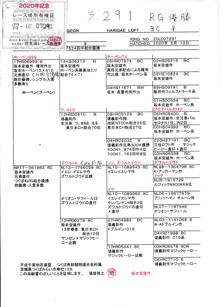 出品鳩♀12番“ラ291号” 「20LC07291 BC ♀」張替雅之鳩舎作翔 21年本八戸春RG524羽総合優勝鳩 坂本ホーベンスリーナイン号×(イエレマ作ズワルド゜ゴウド孫&イサ号サンバンサンN総合2位直仔×13年東日本CH総合12位)娘鳩 との直仔です。ラ604号テルヨ汐見号東日本CH7736羽総合優勝の全兄弟 との直仔です。 父親 ♂8番"ホウベンスリーナイン号"「17HS06999 B」坂本安雄鳩舎作 直仔に21年春RG総合優勝 全兄弟の直仔に RGテルヨ汐見号 東日本CH7736羽総合優勝鳩がいる 坂本ホーベン当たり配合(74×71)直仔×塙作CH総合70位全兄弟鳩 との直仔です。 母親 「日17−061692 BC」坂本安雄鳩舎作 兄弟直仔にRG総合優勝鳩がいる イエレマ作(ズワルド゜ゴウド直仔×イサ号サンバンサンN総合2位)直仔×13年東日本CH総合12位鳩 との直仔です。 詳しくは、添付の血統書の参照をお願いいたします。 <備考> 現在管理人の鳩舎で元気に過ごしています。写真は12/18日に撮影しました。 菅原明鳩舎の概要はこちらをご覧ください |