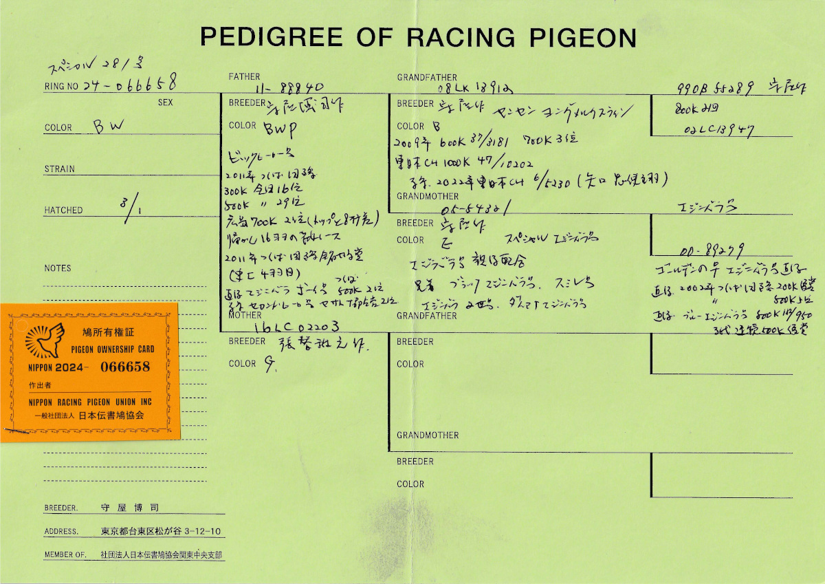 出品鳩♂31番「24−066658 BW♂」守屋博司作ビックヒーロー号つくば国際広島700K全国2位鳩×テルヨ汐見号東日本CH7736羽総合優勝鳩 ![]() |