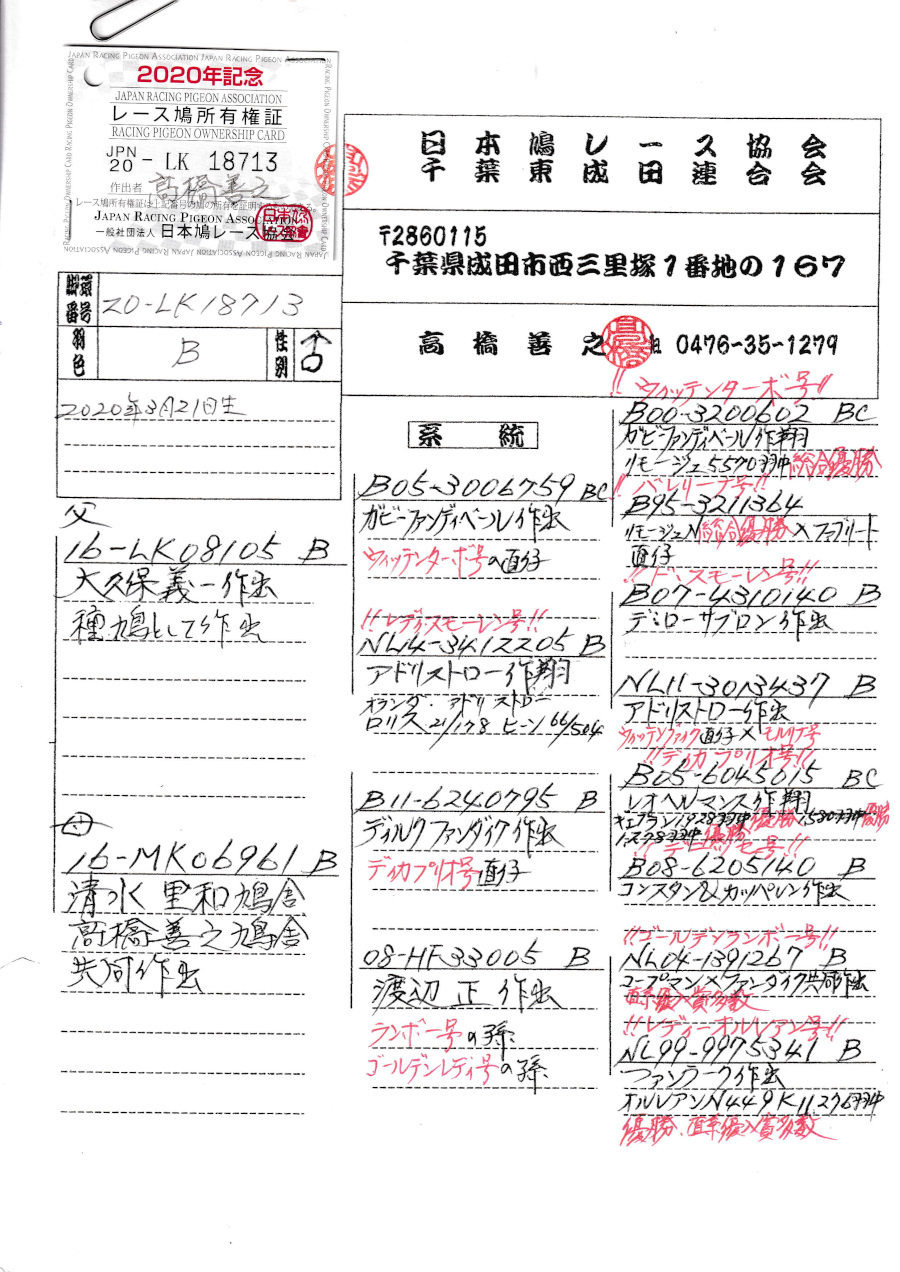 出品鳩♂17番「20LK18713 B ♂」高橋善之鳩舎作直仔に23年GP800K帰還鳩がいる 大久保作 カビー鳩舎ウィッテンターボ号リモージュ5570羽総合優勝の孫×清水・高橋共同作(ファンダイク作ディカプリオ号直仔×渡辺作ゴールデンランボー号の娘)娘鳩 との直仔です。 父親 「16LK08105 B」大久保義一鳩舎作 カビーファンナベール作ウィッテンターボ号リモージュ5570羽総合優勝の直仔×レディスモーレン号アドリストロー作翔ヒーン504羽66位ロリス178羽21位鳩 との直仔です。 母親 「16MK06961 B」清水鳩舎高橋鳩舎共同作 ファンダイク作ディカプリオ号直仔×渡辺作ゴールデンランボー号×レディオルレアン号オルレアンB11276羽総合優勝鳩 との直仔です。 詳しくは、添付の血統書の参照をお願いいたします。 <備考> 現在管理人の鳩舎で元気に過ごしています。写真は12/26日に撮影しました。 菅原明鳩舎の概要はこちらをご覧ください |