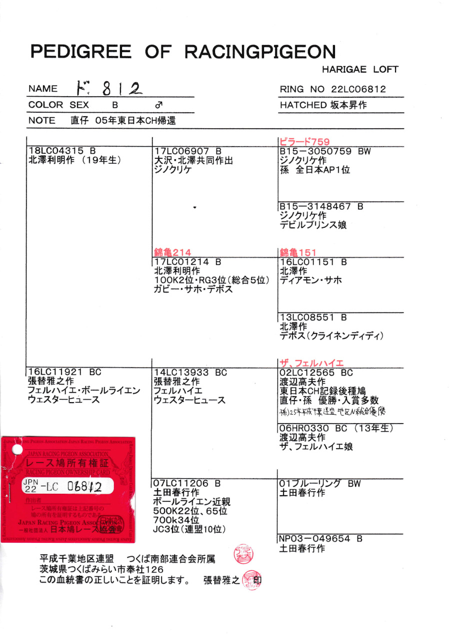 出品鳩♂25番 "ド812号"「22LC06812 B ♂」坂本 昇鳩舎作 直仔に24年東日本CH1000K帰還鳩がいる 北澤作 (両親ジノクリケ作デビルプリンスの孫X錦亀214号RG総合3位)直仔×(ザ・フェルハイエ号直仔×土田作翔ボールライエン近親系700k33位JC3位連盟10位)娘鳩 との直仔です。 父親 19年生「18LC04315 B」北澤利明鳩舎作 両親ジノクリケ作(ピラード759号&全日本AP1位の祖父Xデビルプリンスの娘)直仔X錦亀214号RG総合5位鳩 との直仔です。 母親 ♀1番「16LC11921 BC」張替雅之鳩舎作 フェルハイエ系(ザ・フェルハイエ号東日本CH記録×同鳩の娘)直仔 ×土田作翔ボールライエン近親系700k33位JC3位連盟10位鳩 との直仔です。 詳しくは、添付の血統書の参照をお願いいたします。 <備考> 現在管理人の鳩舎で元気に過ごしています。写真は12/26日に撮影しました。 菅原明鳩舎の概要はこちらをご覧ください |