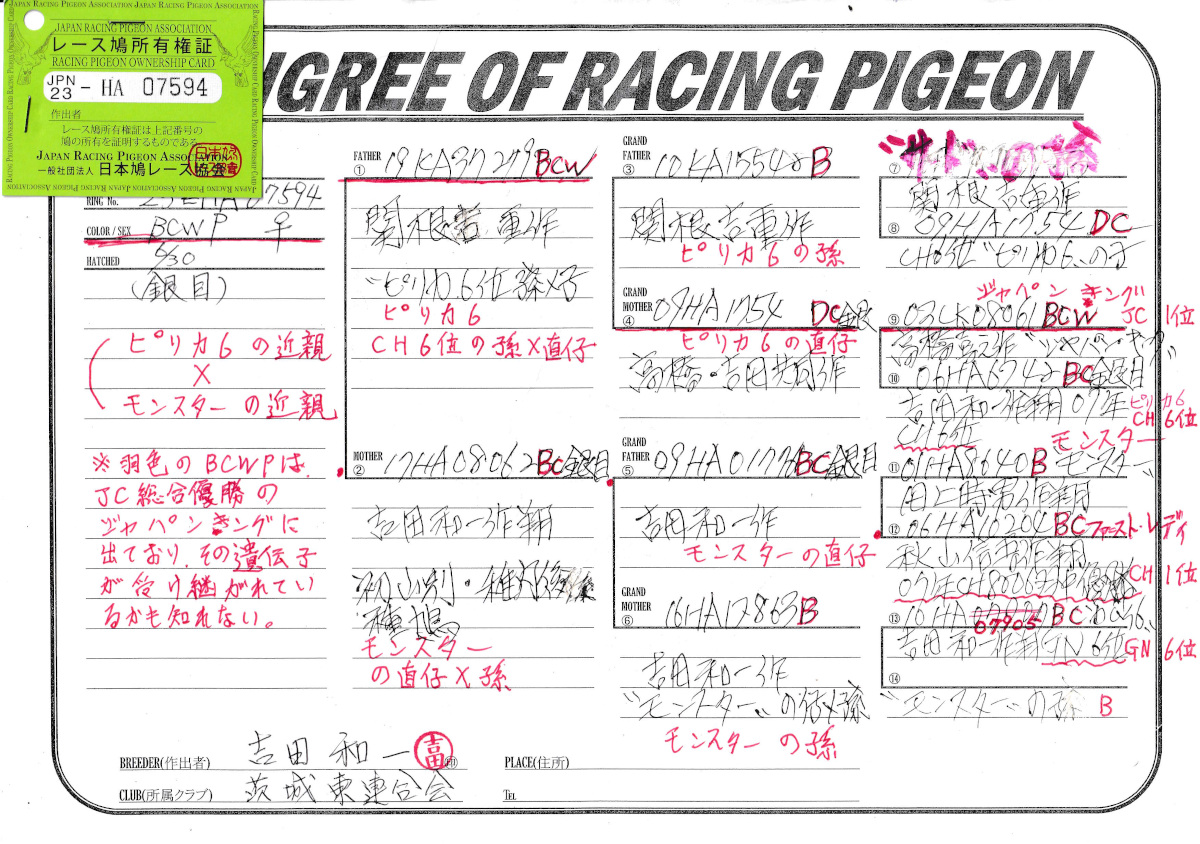 出品鳩♀26番「23HA07594 BCWP♀」吉田和一作(ピリカ6号CH総合6位の孫×ピリカ6号娘)×(東日本CH総合優勝直仔×カムイ6号GN総合6位娘) ![]() |