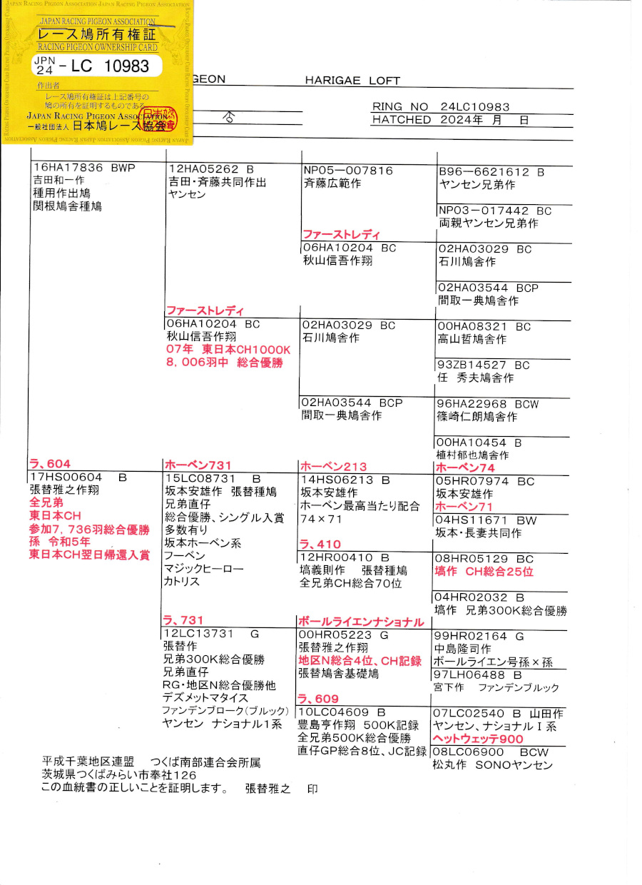 出品鳩♂44番「24LC10983 BWP♂」張替雅之作ファストレディ号東日本CH総合優勝親息子掛け直仔×テルヨ汐見号東日本CH総合優勝の全兄弟 ![]() |