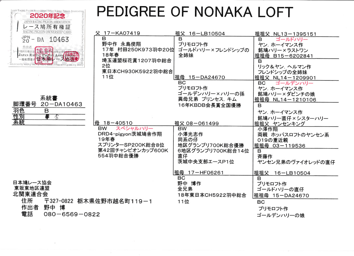 出品鳩♂15番「20DA10463 B ♂」野中 博鳩舎作18年埼玉桜花賞1207羽総合2位東日本CH5922羽総合11位鳩×19年チャンピォンカップ600K554羽総合優勝鳩(東日本CH5922羽総合11位鳩の娘)との直仔です。 父親 「17KA07419 B」野中 博鳩舎作 永島翔 250k973羽20位18年埼玉桜花賞1207羽総合2位東日本CH5922羽総合11位鳩で 両親プリモ作ゴールどハリー号直仔×ゴールデンハリー号娘鳩 との直仔です。 母親 “スペシャルハリー号”「18−40510 BW」DRD4−PIGYON茨城鳩舎作翔 19年SP200K総合8位チャンピォンカップ600K554羽総合優勝鳩で 小澤作ヤンセン系×18年埼玉桜花賞1207羽総合2位東日本CH5922羽総合11位鳩 との直仔です。 詳しくは、添付の血統書の参照をお願いいたします。 <備考> 現在管理人の鳩舎で元気に過ごしています。写真は12/26日に撮影しました。 菅原明鳩舎の概要はこちらをご覧ください |