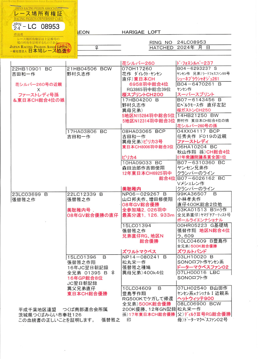 出品鳩♀36番「24LC08953 BC♀」張替雅之作(CH総合4位半兄弟×CH総合4位娘)×(基礎鳩ボールライエンナショナル号孫XJC翌日&テルヨ汐見号半兄弟) ![]() |