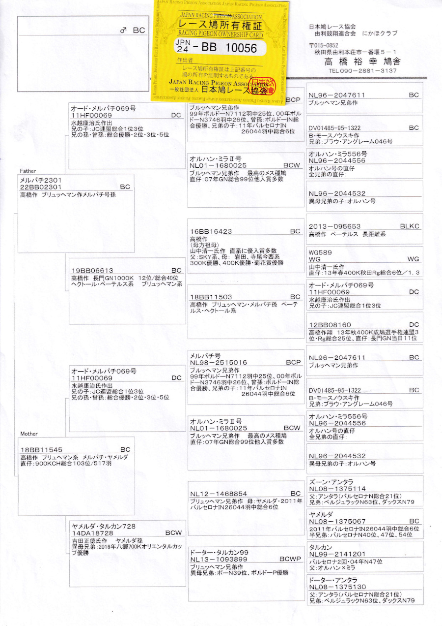 出品鳩♂32番「24BB10056 BC♂」高橋裕幸作半兄弟)CH900K517総合103位 水越作オードメルバチ069号(メルパチ号ボルドーN25位26位直仔)直仔×直娘 ![]() |