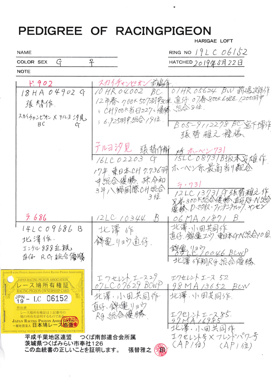 出品鳩♀7番 「19LC06152 G ♀」張替雅之鳩舎作 ド902号(スカイチャンピォン号前島作翔東日本CH総合19位Xテルヨ汐見号東日本CH7736羽中総合優勝)×北澤作錦亀リョウ号RG総合優勝の異父兄弟&錦亀リョウ号の孫鳩 との直仔です。 父親 "ド902号"「18HA04902 G」張替雅之鳩舎作 スカイチャンピォン号前島作翔東日本CH総合19位Xテルヨ汐見号東日本CH7736羽中総合優勝(孫八郷国際CH総合3位) との直仔です。 母親 "ラ686号"「14LC09686 B」北澤利明鳩舎作 直仔にRG総合優勝鳩がいる エンケル888近親 錦亀リョウ号RG総合優勝の直仔&錦亀ユウ号東日本GN総合10位異母兄弟×エクセレントエース29号(錦亀号リョウ号の母親)との直仔です。 詳しくは、添付の血統書の参照をお願いいたします。 <備考> 現在管理人の鳩舎で元気に過ごしています。写真は12/26日に撮影しました。 菅原明鳩舎の概要はこちらをご覧ください |