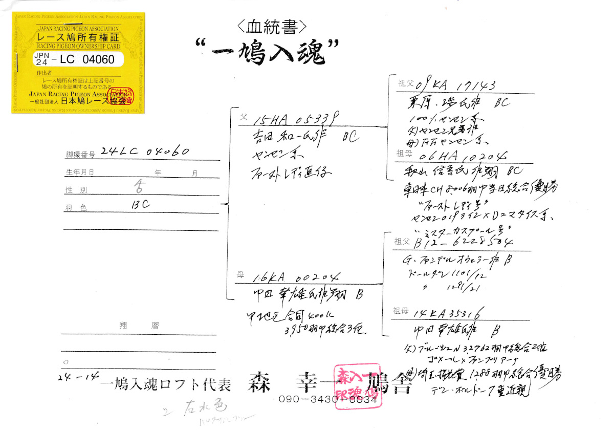出品鳩♂33番「24LC04060 BC ♂」森 幸一鳩舎作吉田作 ヤンセン系ファーストレディ号東日本CH8006羽中総合優勝の直仔×中田作翔 埼玉中地区合同400k3950羽総合3位鳩 との直仔です。 父親 「15HA05339 BC」吉田和一鳩舎作 ヤンセン系 栗原作純ヤンセン系X秋山作翔ファーストレディ号東日本CH8006羽中総合優勝(ヤンセン系&Dマタイス系)との直仔です。 母親 「16KA00204 B」中田幸雄鳩舎作翔 埼玉中地区合同400k3950羽総合3位鳩で ミスターカスプール号ドールダン1201羽12位1291羽21位鳩 ×(ブールジュN32762羽総合2位×埼玉桜花賞1288羽総合優勝)娘鳩 との直仔です。 詳しくは、添付の血統書の参照をお願いいたします。 <備考> 現在管理人の鳩舎で元気に過ごしています。写真は12/26日に撮影しました。 菅原明鳩舎の概要はこちらをご覧ください |