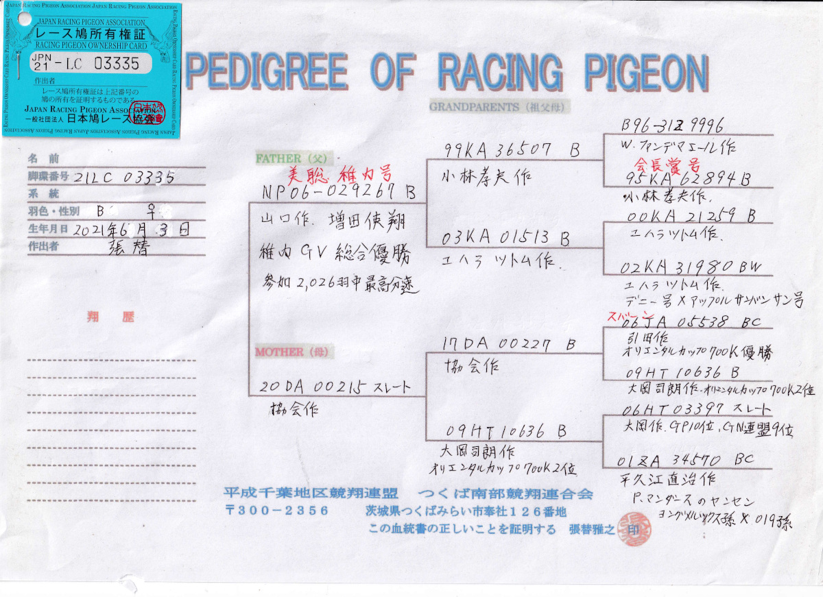 出品鳩♀17番 「21LC03335 B ♀」張替雅之鳩舎作 美聡稚内号08年稚内GV総合優勝・GN合同放鳩最高分速鳩 ×協会作(引田委託八郷700優勝直仔X大岡委託伊賀オリエンタルカップ2位)娘鳩 との直仔です。 父親 "美聡稚内号"「06−029267 B」山口鳩舎作増田鳩舎翔 08年稚内GV総合優勝・GN合同放鳩最高分速鳩 小林作会長賞鳩直仔×ユハラツトム作モンドマルサンN&サンバンサンN総合優勝の孫鳩 との直仔です。 母親 「20DA00215スレート」鳩レース協会作 (引田委託八郷オリエンタルカップ700優勝X大岡委託伊賀オリエンタルカップ2位)直仔X大岡委託伊賀オリエンタルカップ2位鳩 との直仔です。 詳しくは、添付の血統書の参照をお願いいたします。 <備考> 振込または、現金書留でお願いします。 菅原明鳩舎の概要はこちらをご覧ください |