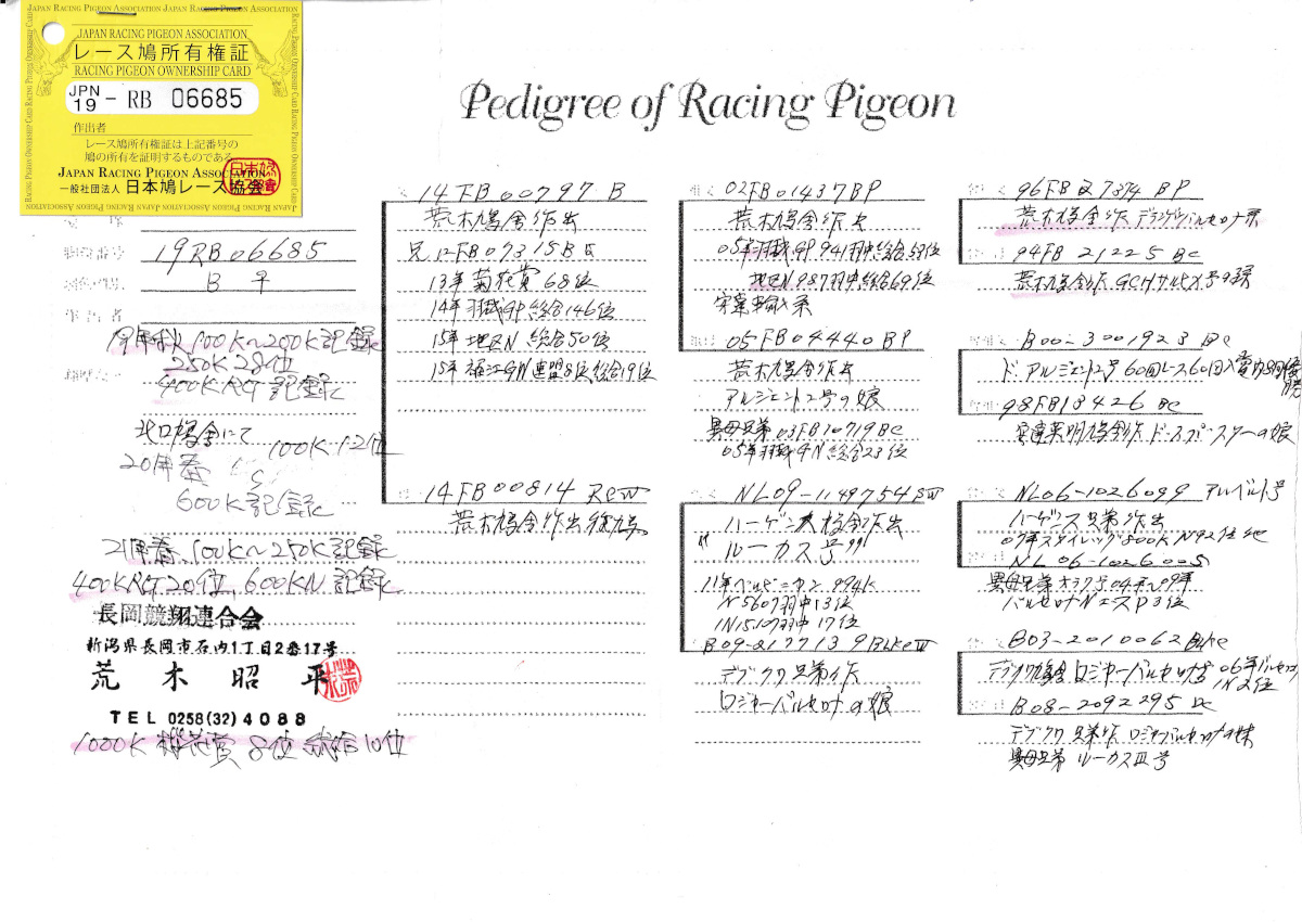 出品鳩♀10番「19RB06685 B ♀」荒木昭平鳩舎作北口鳩舎翔21年RG400k20位 600k記録 1000K桜花賞8位総合10位鳩で 福江GN総合19位の兄弟×ルーカス号ペルピナンIN17位の娘鳩 との直仔です。 父親 「14FB00797 B」荒木昭平鳩舎作 兄鳩に 福江GN総合19位地区N総合50位鳩がいる 羽越GP941羽総合53位(GCHサルヒメ号系)×ド・アルジェントン号アルジェントンN15位の娘鳩 との直仔です。 母親 「14FB00814 RCW」荒木昭平鳩舎作 ハーゲンス作翔ルーカス号ペルピナンIN17位鳩×デブクワ作ロジャーバルセロナ号バルセロナN優勝IN総合2位の娘鳩 との直仔です。 詳しくは、添付の血統書の参照をお願いいたします。 <備考> 現在管理人の鳩舎で元気に過ごしています。写真は12/29日に撮影しました。 菅原明鳩舎の概要はこちらをご覧ください |