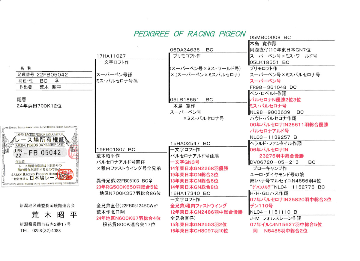 出品鳩♀23番「22FB05042 BC ♀」荒木昭平鳩舎作翔浜田700K12位鳩で 一文字ロフト作スーハーベン号3重近親孫 ×両親一文字作(バルセロナ・アルド号バルセロナIN総合優勝直仔×稚内ファストウィング号12年東日本GN2486羽総合優勝の全兄弟)娘鳩 との直仔です。 父親 「17HA11027」一文字ロフト作 直仔に浜田700k12位鳩がいる スーハーベン号3重近親孫 プリモ作(スーパーベン・ミスワールド×スーパーベン・ミスバルセロナ)直仔×木島作(スーパーベン×ミスバルセロナ)娘鳩 との直仔です。 母親 ♀7番「19FB01807 BC ♀」荒木昭平鳩舎作 直仔に浜田700k12位鳩 異母兄弟にRG500K650羽総合5位鳩がいる 両親一文字作バルセロナ・アルド号バルセロナIN総合優勝直仔×稚内ファストウィング号12年東日本GN2486羽総合優勝の全兄弟鳩 との直仔です。 詳しくは、添付の血統書の参照をお願いいたします。 <備考> 現在管理人の鳩舎で元気に過ごしています。写真は12/29日に撮影しました。 菅原明鳩舎の概要はこちらをご覧ください |