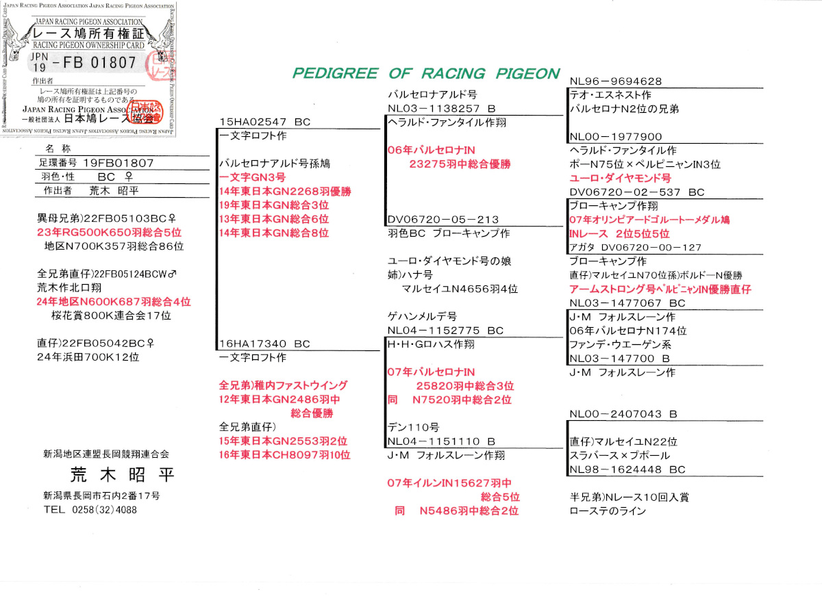 出品鳩♀7番「19FB01807 BC♀」荒木昭平作直仔)浜田700k12位半兄弟)RG500K総合5位鳩 両親一文字作バルセロナアルド号直仔×稚内ファストウィング号全兄弟 ![]() |