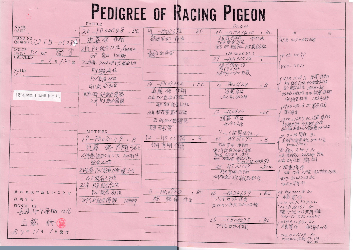 出品鳩♂40番「22FB05284 DCW ♂」近藤 修鳩舎作22年平戸GN181羽総合優勝 地区N700K総合11位22位 GP総合24位入賞鳩×地区N総合12位33位GP総合30位入賞鳩 同士の直仔です。 父親 「20FB00048 DC」近藤 修鳩舎作翔 地区N総合12位33位GP総合30位 兄弟にもGP&RG総合優勝鳩がいる 福田作ヤンセン・APデズメット系×秋RG総合優勝GP総合12位鳩 との直仔です。 母親 「19FB020459 B」近藤 修鳩舎作翔 22年平戸GN181羽総合優勝 地区N700K総合11位22位 GP総合24位入賞鳩で 竹井作つくば男体94号東日本CH総合34位桜花賞総合3位直仔×林作両親プリモ作スーパーベン号近親鳩 との直仔です。 詳しくは、添付の血統書の参照をお願いいたします。 ※作出者が当該鳩を同腹鳩と勘違いして「血統書」を発行したまま現在に至り、現在「所有権証」調達中です。 <備考> 現在管理人の鳩舎で元気に過ごしています。写真は12/29日に撮影しました。 菅原明鳩舎の概要はこちらをご覧ください |