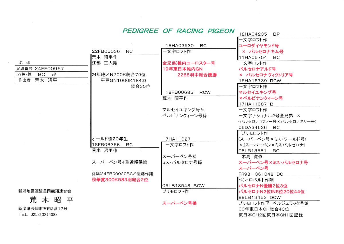 出品鳩♂73番「24FF00967 BC ♂」荒木昭平鳩舎作純一文字系地区N総合79位平戸GN1000K184羽総合35位鳩×スーパーベン号4重近親孫( スーハーベン号3重近親孫×スーパーベン号娘鳩)との直仔です。 父親 「22FB05036 RC」荒木昭平鳩舎作江部鳩舎翔 地区N総合79位平戸GN1000K184羽総合35位鳩で 一文字作稚内ユーロスター号GN総合優勝全兄弟×ヘルピナンクィン号ペルピナンIN総合優勝の孫鳩 との直仔です。 母親 ♀16番20年生「18FB06356 B ♀」荒木昭平鳩舎作孫鳩に秋華賞300K583羽総合2位鳩がいる スーパーベン号4重近親孫( スーハーベン号3重近親孫×スーパーベン号娘鳩)との直仔です。 詳しくは、添付の血統書の参照をお願いいたします。 当該鳩の「所有権証」は再発行手続き中のため後送となります。 <備考> 現在管理人の鳩舎で元気に過ごしています。写真は12/29日に撮影しました。 菅原明鳩舎の概要はこちらをご覧ください |