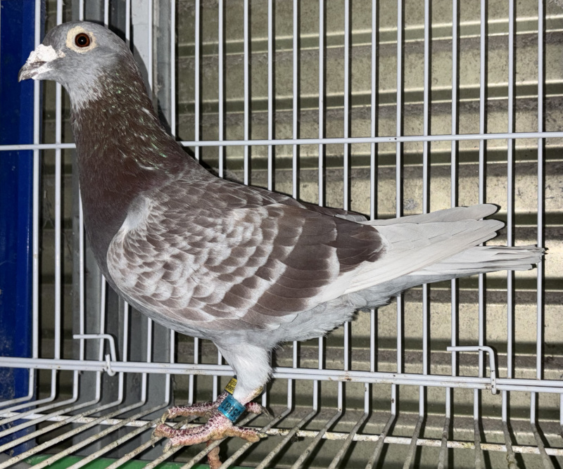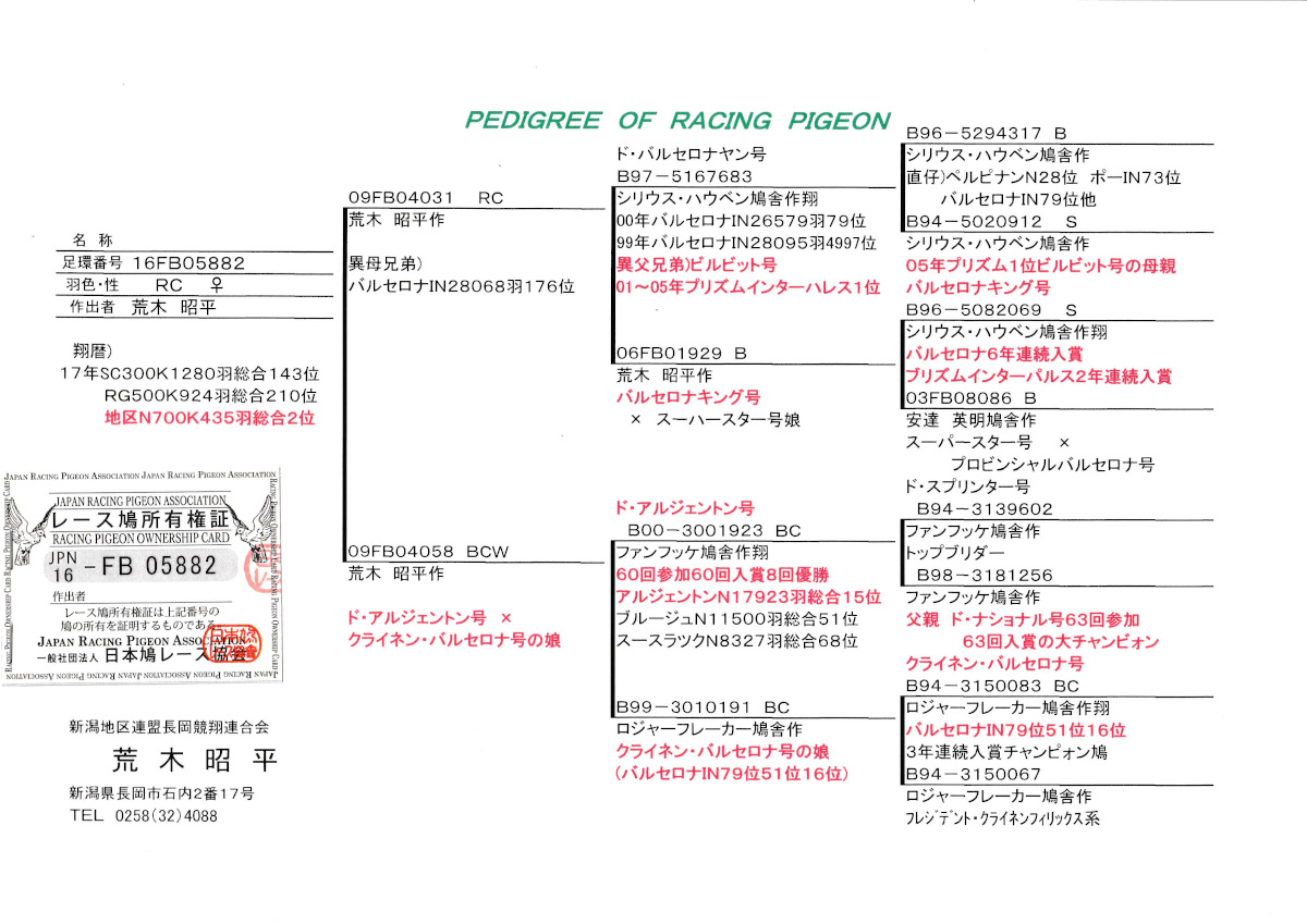 出品鳩♀4番「16FB05882 RC ♀」荒木昭平鳩舎作翔RG500K924羽総合210位地区N700K435羽総合2位鳩でハウベン作翔バルセロナヤン号バルセロナIN26579羽79位直仔×ド・アルジェントン号アルジェントンN17923羽15位の娘鳩 との直仔です。 父親 「09FB04031 RC」荒木昭平鳩舎作 異母兄弟にバルロナIN176位鳩がいる ハウベン作翔バルセロナヤン号バルセロナIN26579羽79位×(バルセロナキング号×スーパースター号の娘)娘鳩 との直仔です。 母親 「09FB04058 BCW」荒木昭平鳩舎作 ド・アルジェントン号参加60回入賞8回優勝アルジェントンN17923羽15位鳩×フレーカー作クライネンバルセロナ号バルセロナIN16位51位79位の娘鳩 との直仔です。 詳しくは、添付の血統書の参照をお願いいたします。 <備考> 現在管理人の鳩舎で元気に過ごしています。写真は12/29日に撮影しました。 菅原明鳩舎の概要はこちらをご覧ください |