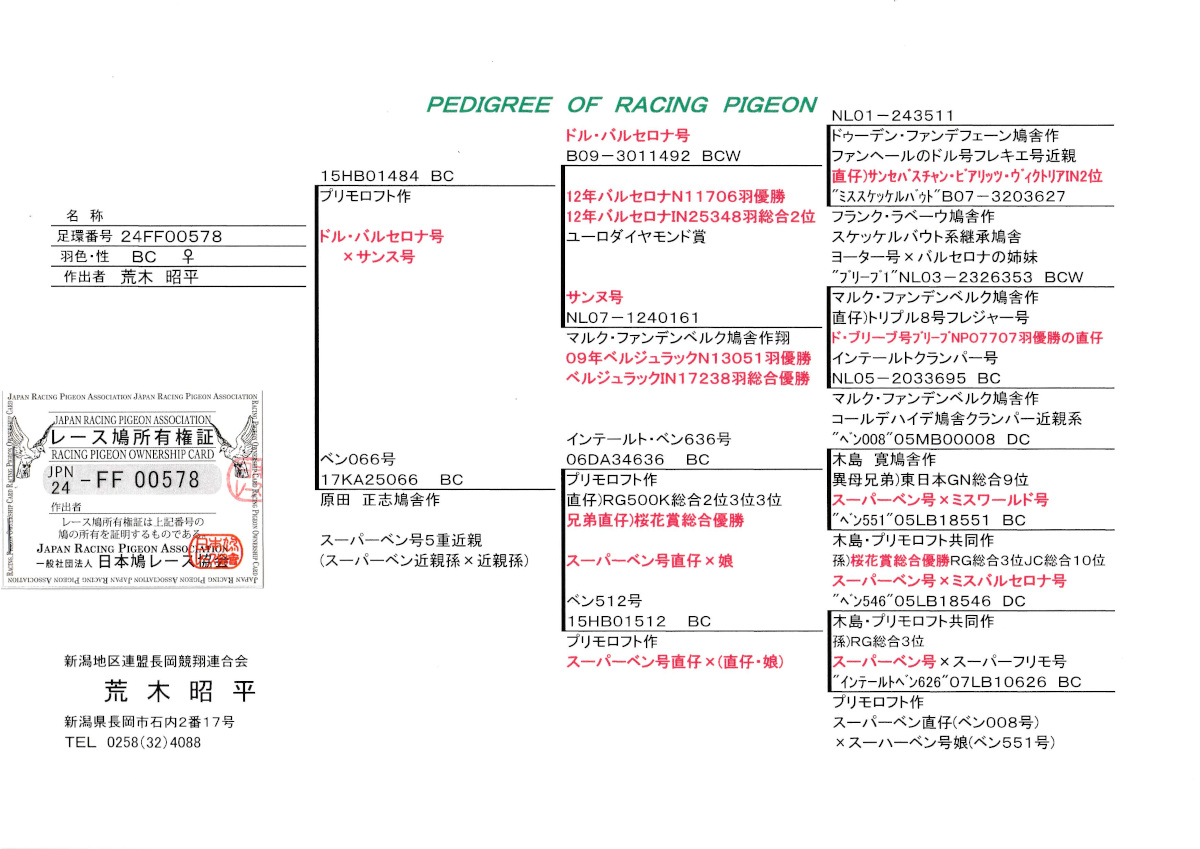 出品鳩♀70番「24FF00578 BC♀」荒木昭平作プリモ作ドルバルセロナ号バルセロナN優勝IN総合2位直仔×原田作両親プリモ作 スーパーベン号5重近親鳩 ![]() |