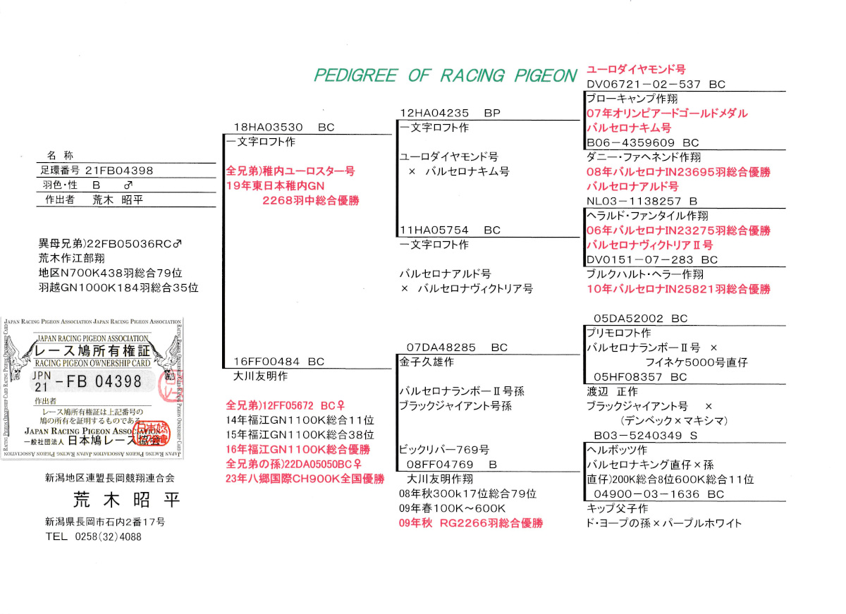 出品鳩♂32番「21FB04398 B ♂」荒木昭平鳩舎作異母兄弟に地区N700K総合79位羽越GN1000K184羽総合35位鳩がいる 一文字ロフト作稚内ユーロスター号GN総合優勝鳩全兄弟鳩×大川作16年福江GN1100K総合優勝の全兄弟鳩 との直仔です。 父親 「18HA03530 BC」一文字ロフト作直仔)地区N700K総合79位 羽越GN1000K184羽総合35位鳩がいる 全兄弟に稚内ユーロスター号GN総合優勝鳩全兄弟鳩で(ユーロダイヤモンド号×バルセロナキム号)直仔×(バルセロナアルド号×バルセロナヴィクトリアU号)娘鳩 との直仔です。 母親 「16FF00484 BC」大川知明鳩舎作 ビックリバーGN672号16年福江GN1100K総合優勝14年総合11位15年総合38位の全兄弟鳩で (プリモ作バルセロナランボーU号直仔×渡辺作ブラックジャンアント号娘)直仔×ビックリバー769号秋RG2266羽総合優勝鳩 との直仔です。 詳しくは、添付の血統書の参照をお願いいたします。 <備考> 現在管理人の鳩舎で元気に過ごしています。写真は12/29日に撮影しました。 菅原明鳩舎の概要はこちらをご覧ください |