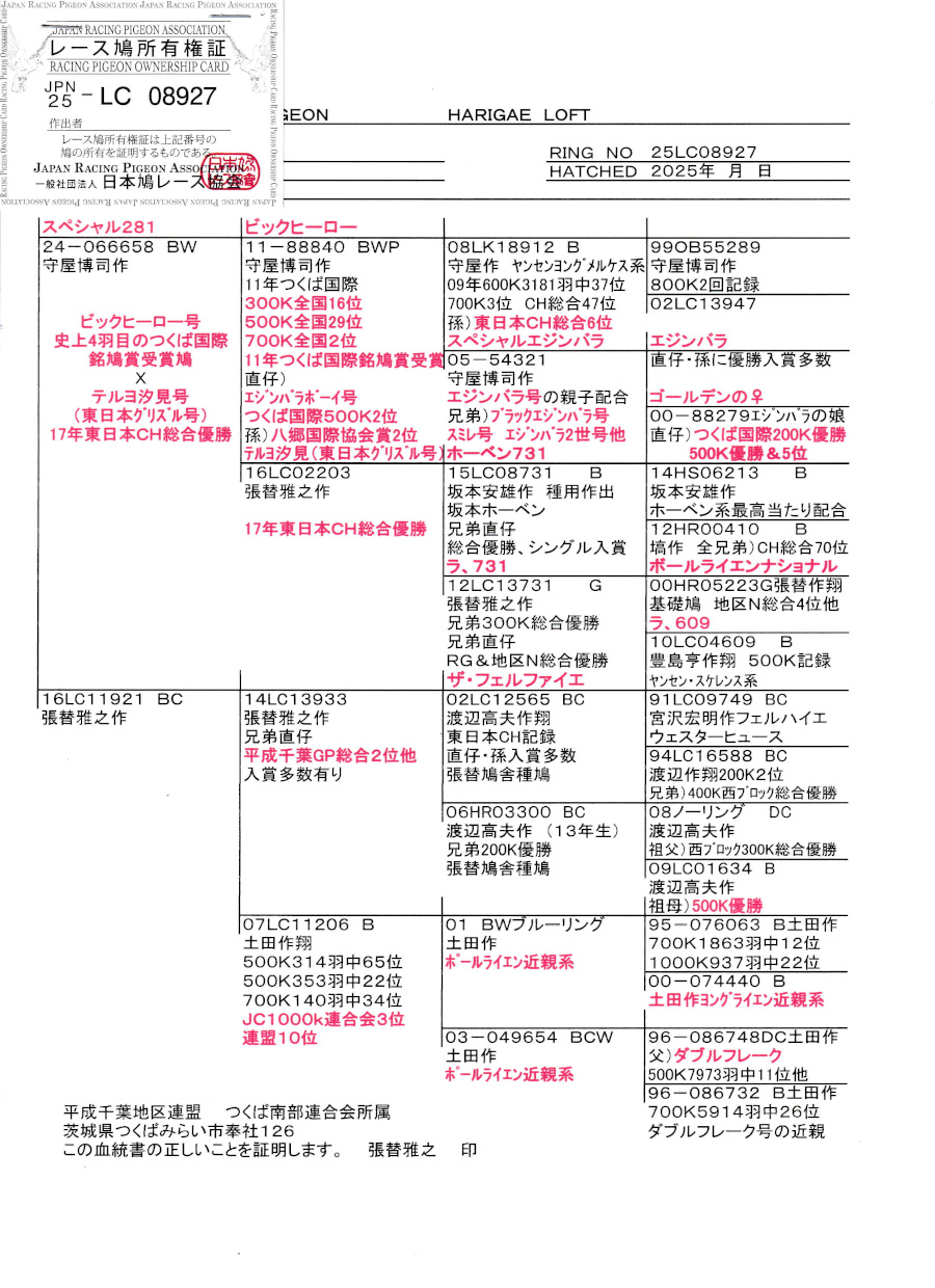 出品鳩若27番「25LC08927 BW」張替雅之鳩舎作守屋作(ビックヒーロー号つくば国際広島700K全国2位鳩×テルヨ汐見号東日本CH7736羽総合優勝鳩)直仔×(フェルハイエ系×ボールライエン近親系JC3位連盟10位)娘鳩 との直仔です。 父親 ♂31番 "スペシャル281"「24−066658 BW ♂」守屋博司鳩舎作ビックヒーロー号つくば国際300K全16位500k全国29位広島700K全国2位鳩×テルヨ汐見号東日本CH7736羽総合優勝鳩同士の直仔です。 母親 ♀1番「16LC11921 BC」張替雅之鳩舎作 フェルハイエ系(ザ・フェルハイエ号東日本CH記録×同鳩の娘)直仔 ×土田作翔ボールライエン近親系700k33位JC3位連盟10位鳩 との直仔です。 詳しくは、添付の血統書の参照をお願いいたします。 <備考> 現在管理人の鳩舎で元気に過ごしています。写真は1/5日に撮影しました。 菅原明鳩舎の概要はこちらをご覧ください |