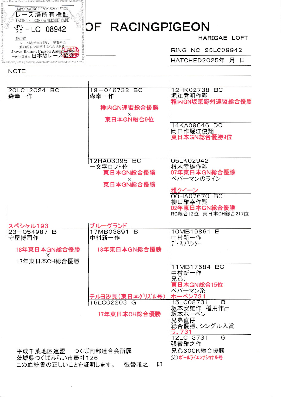 出品鳩若39番「25LC08942 BW」張替雅之鳩舎作(両親堀江翔作GN連盟優勝&GN連盟優勝総合9位直仔X根本作GN総合優勝&柳田作GN総合優勝の娘)直仔×守屋作(ブルーグランド号東日本GN総合優勝×テルヨ汐見号東日本CH総合優勝)娘鳩 との直仔です。 父親 「20LC12024 BC」森 幸一鳩舎作両親堀江翔(稚内GN連盟優勝×東日本GN連盟優勝総合9位)直仔X一文字作(根本作東日本GN総合優勝×柳田作東日本GN総合優勝)娘鳩 との直仔です。 母親 ♀23番 "スペシャル193号"「23−054987 B ♀」守屋博司鳩舎作ブルーグランド号東日本GN1100k1781羽中総合優勝×テルヨ汐見号東日本CH7736羽総合優勝鳩同士の直仔です。 詳しくは、添付の血統書の参照をお願いいたします。 <備考> 現在管理人の鳩舎で元気に過ごしています。写真は1/5日に撮影しました。 菅原明鳩舎の概要はこちらをご覧ください |