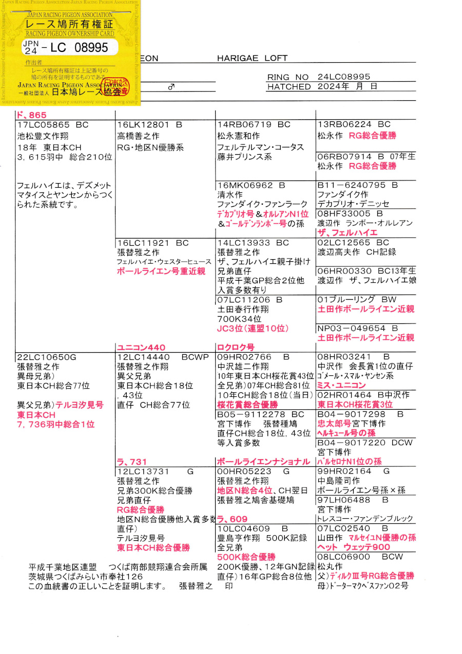 出品鳩♂39番「24LC08995 B ♂」張替雅之鳩舎作ド865号池松作翔18年東日本CH3615羽総合210位鳩 ×テルヨ汐見号 東日本CH7736羽総合優勝の異父兄弟鳩 との直仔です。 父親 "ド865号"「17LC05865 BC」池松豊文鳩舎作翔 18年東日本CH3615羽総合210位鳩で(藤井輸入系RG総合優勝ペァー直仔Xデカプリオ号&ゴールデンランボー号の孫)直仔X(ザ・フェルハイエ号直仔×ボールライエン近親JC連盟3位)娘鳩 との直仔です。 母親 ♀22番 「22LC10650 G」張替雅之鳩舎作異父兄弟にテルヨ汐見号 東日本CH7736羽総合優勝鳩 東日本CH総合787位鳩がいる ユニコン440号(中沢作翔ロクロク号桜花賞43位直仔×ラ731号基礎鳩ボールライエンナショナル号地区N総合4位孫鳩 との直仔です。 詳しくは、添付の血統書の参照をお願いいたします。 <備考> 現在管理人の鳩舎で元気に過ごしています。写真は1/5日に撮影しました。 菅原明鳩舎の概要はこちらをご覧ください |