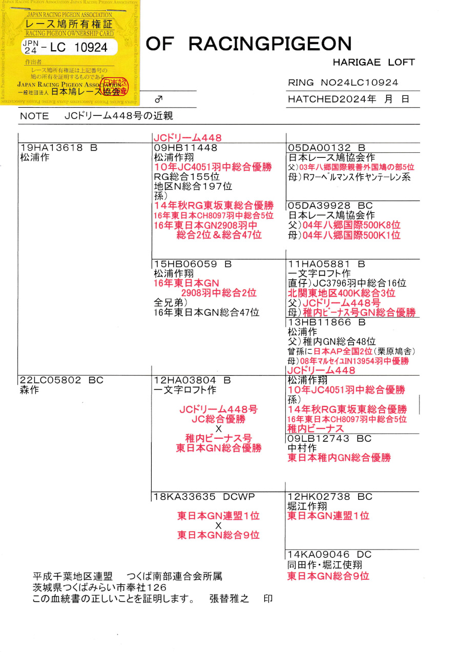出品鳩♂41番「24LC10924 BC ♂」張替雅之鳩舎作松浦作(JCドリーム448号Jカップ総合優勝鳩X16年東日本GN総合2位)直仔×森作(JCドリーム448号Jカップ総合優勝&稚内ビーナス号東日本GN総合優勝直仔X両親堀江翔東日本GN連盟優勝&東日本GN総合9位娘)娘鳩 との直仔です。 父親 「19HA13618 B」松浦邦彦鳩舎作 JCドリーム448号10年Jカップ4051羽中総合優勝鳩 X16年東日本GN2908羽中総合2位&JCドリーム448号&稚内ビーナス号孫鳩 との直仔です。 母親 「22LC05802 BC」森 幸一鳩舎作 (JCドリーム448号10年Jカップ総合優勝X稚内ビーナス号中村作翔東日本GN総合優勝)直仔X両親堀江翔(東日本GN連盟優勝X東日本GN総合9位)娘鳩 との直仔です。 詳しくは、添付の血統書の参照をお願いいたします。 <備考> 現在管理人の鳩舎で元気に過ごしています。写真は1/5日に撮影しました。 菅原明鳩舎の概要はこちらをご覧ください |