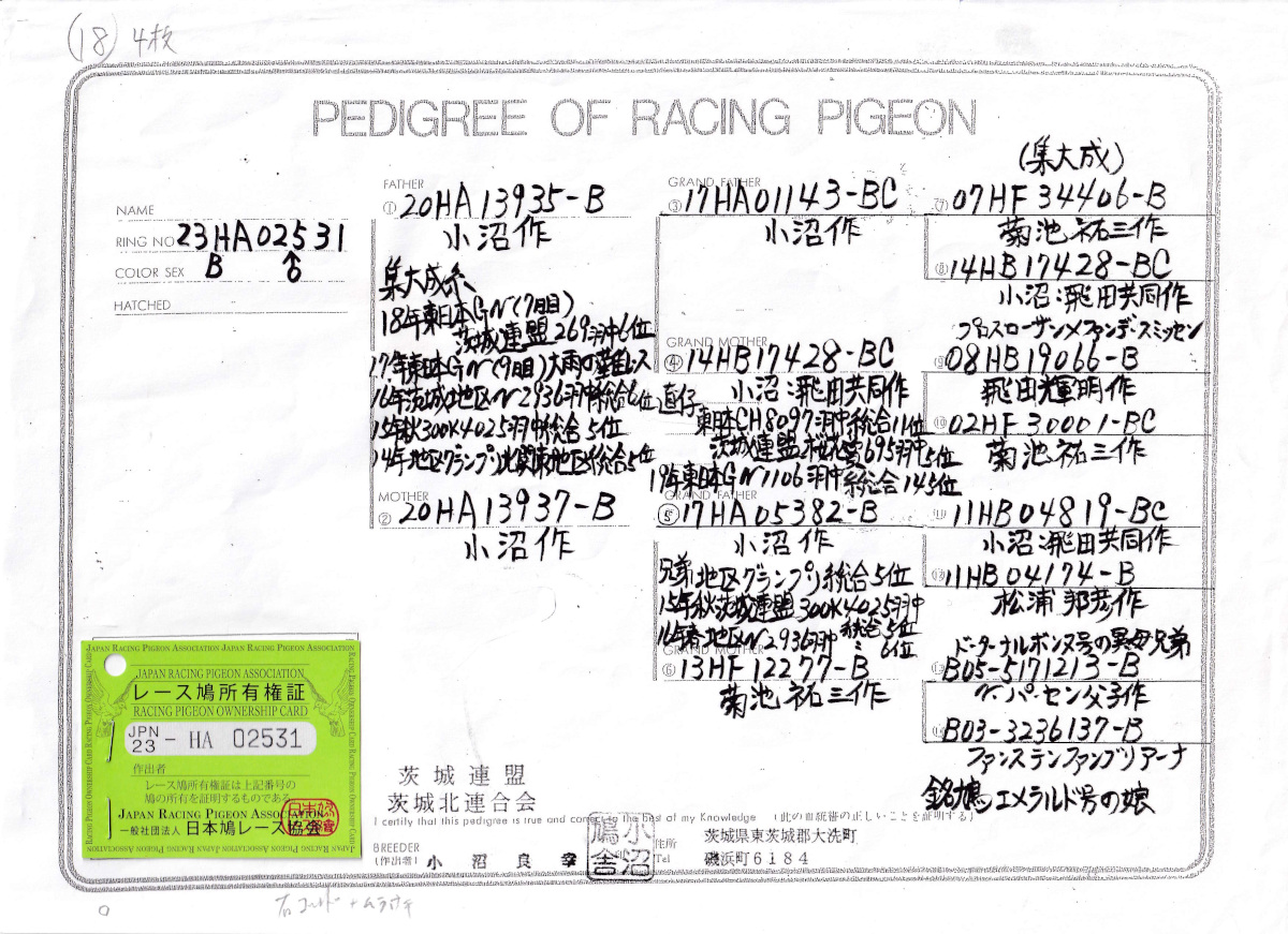出品鳩♂28番「23HA02531 B ♂」小沼良幸鳩舎作集大成系 東日本CH8097羽総合11位桜花賞695羽5位異母兄弟(集大成号孫)×(GP地区総合5位地区N総合6位の全兄弟X菊池作ファンブリアーナ作エメラルド号孫)娘鳩 との直仔です。 父親 「20HA13935 B」小沼良幸鳩舎作 集大成系 異父兄弟に 東日本CH8097羽総合11位桜花賞695羽5位鳩 東日本GN1106羽総合145位鳩がいる 集大成号の直仔X小沼・飛田共同作鳩 との直仔です。 母親 「20HA13937 B」小沼良幸鳩舎作 GP地区総合5位地区N総合6位の全兄弟X菊池作(Nパーセン作ドーターナルボンヌ号異母兄弟×ファンブリアーナ作エメラルド号の娘鳩 との直仔です。 詳しくは、添付の血統書の参照をお願いいたします。 <備考> 現在管理人の鳩舎で元気に過ごしています。写真は1/5日に撮影しました。 菅原明鳩舎の概要はこちらをご覧ください |