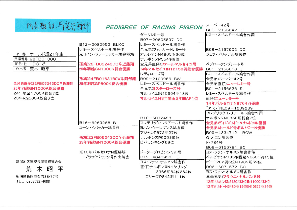 出品鳩♂36番21年生「98FB01300 BC♂」荒木正平作全兄弟直仔)25年羽越GN1000K総合優勝 レミー・スペルドール作×コーンバッカー作 ![]() |