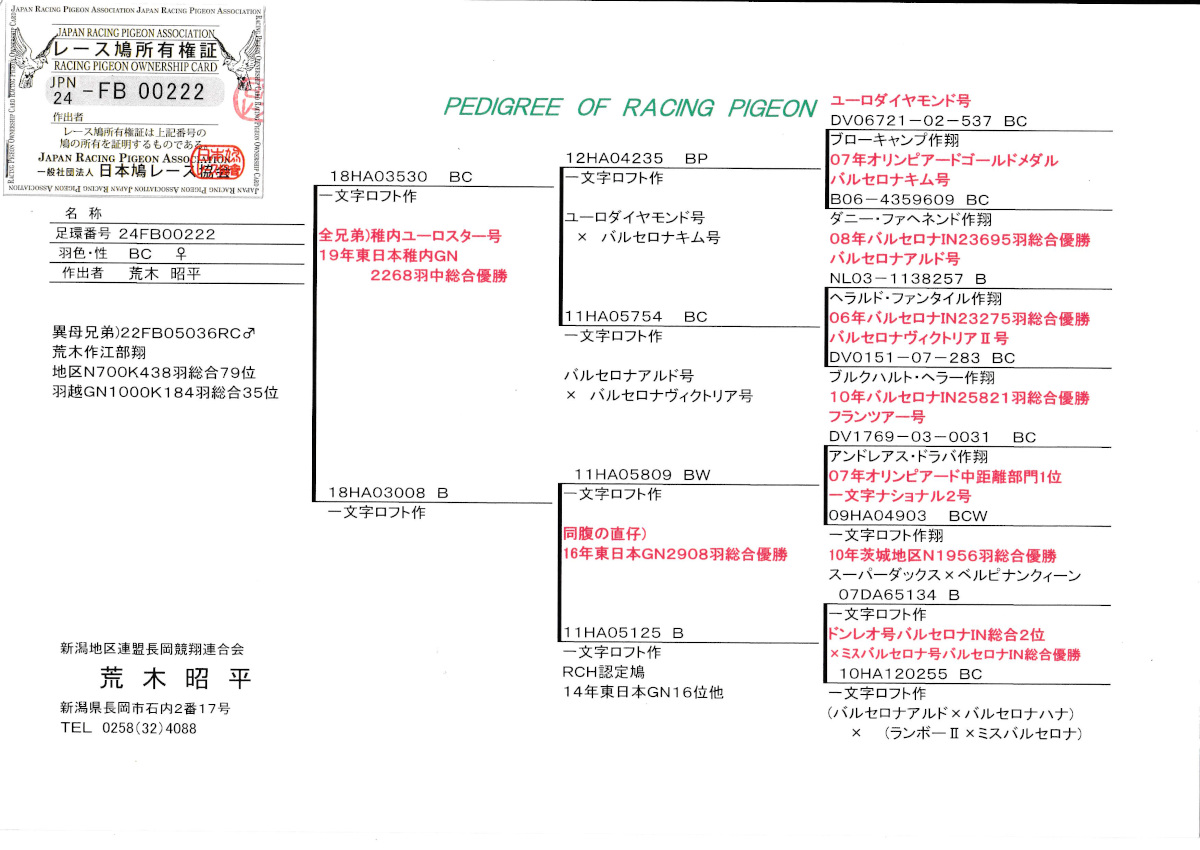 出品鳩♀52番「24FB00222 BC ♀」荒木昭平鳩舎作異母兄弟に地区N700K総合79位羽越GN1000K184羽総合35位鳩がいる 両親一文字作稚内ユーロスター号GN総合優勝鳩全兄弟×RCH認定鳩東日本GN16位の娘鳩 との直仔です。 父親 「18HA03530 BC」一文字ロフト作直仔)地区N700K総合79位 羽越GN1000K184羽総合35位鳩がいる 稚内ユーロスター号GN総合優勝全兄弟鳩で(ユーロダイヤモンド号×バルセロナキム号)直仔×(バルセロナアルド号×バルセロナヴィクトリアU号)娘鳩 との直仔です。 母親 「18HA03008 B」一文字ロフト作 (フライツァー号×一文字ナショナルU号地区N総合優勝)直仔×RCH認定鳩東日本GN16位(ドンレオ号ミスバルセロナ号孫鳩)鳩 との直仔です。 詳しくは、添付の血統書の参照をお願いいたします。 ※出品鳩一覧表の当該鳩両親の記載が間違えておりましたので正規の血統書でのご紹介です。 <備考> 在管理人の鳩舎で元気に過ごしています。写真は12/29日に撮影しました。 菅原明鳩舎の概要はこちらをご覧ください |