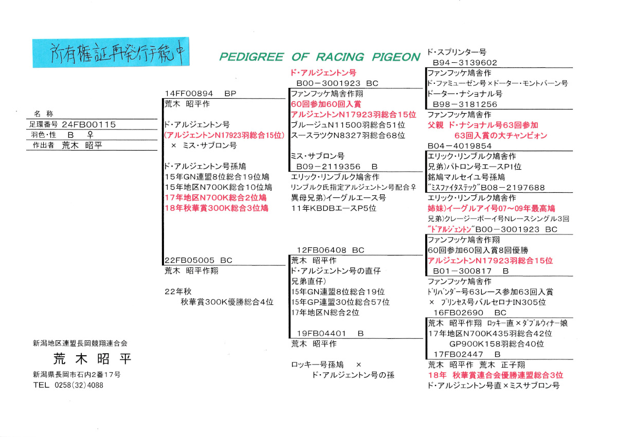 出品鳩♀38番「24FB00115 B ♀」荒木作ド・アルジェントン号8回優勝アルジェントンN15位直仔×秋華賞300K総合4位(ド・アルジェントン号近親孫) ![]() |