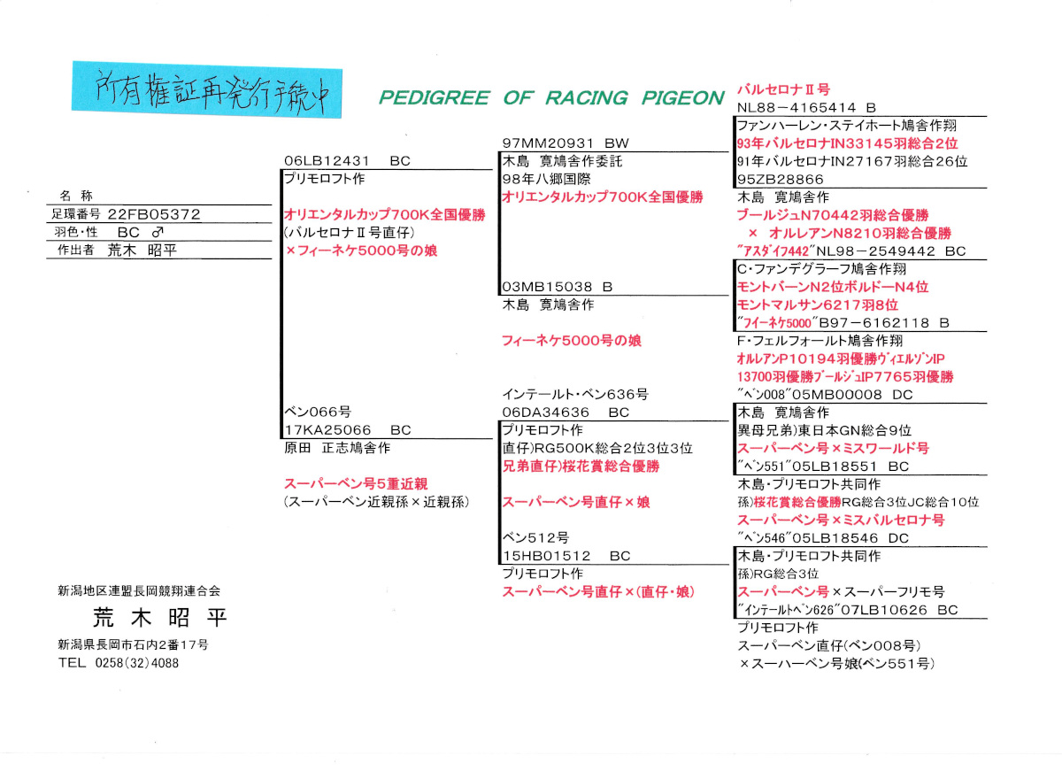 出品鳩♂41番「22FB05372 BC ♂」荒木昭平鳩舎作プリモロフト作両親木島作(八郷オリエンタルカップ700K優勝×フィーネケ5000号の娘)×原田作両親プリモ作 スーパーベン号5重近親鳩 との直仔です。 父親 「06LB12431 BC」プリモロフト作 両親木島作 八郷オリエンタルカップ700K優勝(バルセロナU号直仔)×フィーネケ5000号の娘鳩 との直仔です。 母親 “ベン066号”「17KA25066 BC」原田正志鳩舎作 両親プリモ作 スーパーベン号5重近親 (スーパーベン号直仔×娘)直仔×(スーパーベン号直仔×直仔/娘)娘鳩 との直仔です。 詳しくは、添付の血統書の参照をお願いいたします。 <備考> 現在管理人の鳩舎で元気に過ごしています。写真は1/7日に撮影しました。 菅原明鳩舎の概要はこちらをご覧ください |