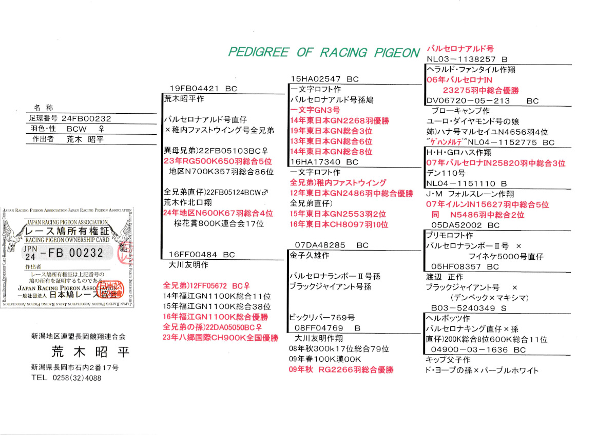 出品鳩♀53番「24FB00232 BCW ♀」荒木昭平鳩舎作RG500K650羽総合5位異母兄弟(バルセロナ・アルド号直仔×稚内ファストウィング号兄弟)×大川作 ビックリバーGN672号福江GN総合優勝総合11位総合38位の全兄弟鳩 との直仔です。 父親 ♂15番「19FB04421 BC ♂」荒木昭平鳩舎作 異母兄弟にRG500K650羽総合5位鳩がいる 両親一文字作バルセロナ・アルド号バルセロナIN総合優勝直仔×稚内ファストウィング号12年東日本GN2486羽総合優勝の全兄弟鳩 との直仔です。 母親 ♀5番「16FF00484 BC」大川知明鳩舎作 ビックリバーGN672号16年福江GN1100K総合優勝14年総合11位15年総合38位の全兄弟鳩で (プリモ作バルセロナランボーU号直仔×渡辺作ブラックジャンアント号娘)直仔×ビックリバー769号秋RG2266羽総合優勝鳩 との直仔です。 詳しくは、添付の血統書の参照をお願いいたします。 <備考> 振込または、現金書留でお願いします。 菅原明鳩舎の概要はこちらをご覧ください |
