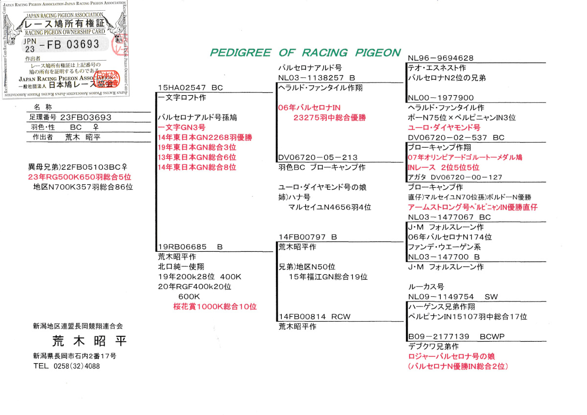 出品鳩♀28「23FB03693 BC ♀」荒木昭平鳩舎作異母兄弟にRG500K650羽総合5位鳩がいる 一文字作バルセロナ・アルド号バルセロナIN総合優勝の直仔×1000K桜花賞8位総合10位&ルーカス号ペルピナンIN17位孫鳩 との直仔です。 父親 「15HA02547 BC」一文字ロフト作 直仔にRG500K総合5位地区N700k総合86位鳩がいる バルセロナ・アルド号バルセロナIN総合優勝×ブローキャンプ作ユーロダイヤモンド号娘鳩 との直仔です。 母親 ♀10番「19RB06685 B ♀」荒木昭平鳩舎作北口鳩舎翔21年RG400k20位 600k記録 1000K桜花賞8位総合10位鳩で 福江GN総合19位の兄弟×ルーカス号ペルピナンIN17位の娘鳩 との直仔です。 詳しくは、添付の血統書の参照をお願いいたします。 <備考> 現在管理人の鳩舎で元気に過ごしています。写真は1/7日に撮影しました。 菅原明鳩舎の概要はこちらをご覧ください |