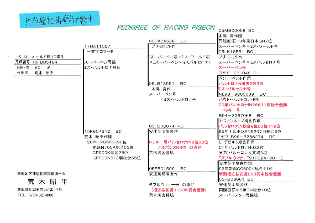 出品鳩♂16番19年生「18FB05184 BC ♂」荒木昭平鳩舎作 一文字ロフト作 スーハーベン号3重近親孫 ×地区N総合53位GP総合55位両親安達作(ロッキー号バルセロナIN9位直仔×福江桜花賞総合優勝娘)娘鳩 との直仔です。 父親 「17HA11027」一文字ロフト作 スーハーベン号3重近親孫 プリモ作(スーパーベン・ミスワールド×スーパーベン・ミスバルセロナ)直仔×木島作(スーパーベン×ミスバルセロナ)娘鳩 との直仔です。 母親 ♀2番「15FB07342 BC ♀」荒木昭平鳩舎作翔地区N700K総合53位GP900K連盟25位513羽総合55位鳩で 両親安達作ロッキー号ファンネーノ作翔バルセロナIN9位63位113位ナルボンヌN9位直仔×ダブルウィナー号福江桜花賞1000K総合優勝の娘鳩 との直仔です。 詳しくは、添付の血統書の参照をお願いいたします。 <備考> 振込または、現金書留でお願いします。 菅原明鳩舎の概要はこちらをご覧ください |