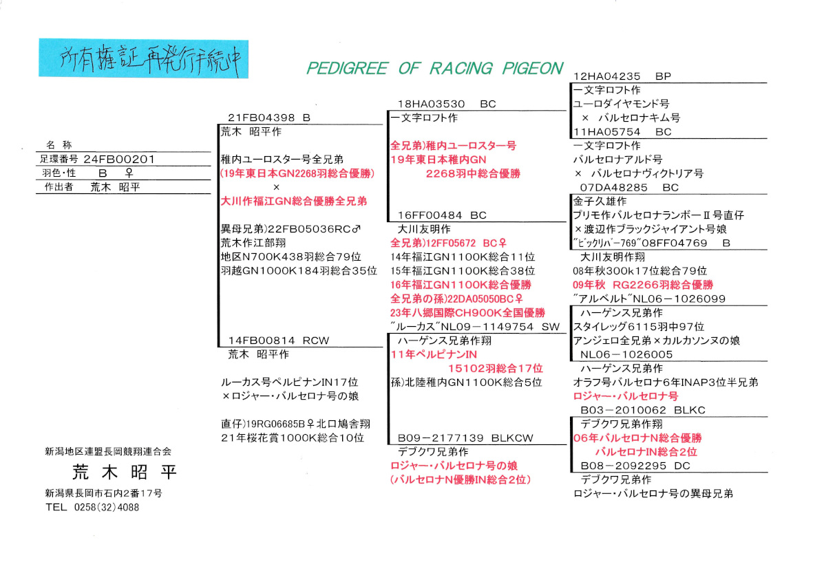 出品鳩♀50番「24FB00201 B ♀」荒木昭平鳩舎作異父兄弟に1000K桜花賞8位総合10位入賞鳩がいる羽越GN1000K184羽総合35位異母兄弟鳩(稚内ユーロスター号全兄弟鳩×大川作福江GN総合優勝全兄弟)×(ルーカス号ペルピナンIN17位娘鳩 との直仔です。 父親 ♂32番「21FB04398 B」荒木昭平鳩舎作異母兄弟に地区N700K総合79位羽越GN1000K184羽総合35位鳩がいる 一文字ロフト作稚内ユーロスター号GN総合優勝鳩全兄弟鳩×大川作16年福江GN1100K総合優勝の全兄弟鳩 との直仔です。 母親 「14FB00814 RCW」荒木昭平鳩舎作 直仔に1000K桜花賞8位総合10位入賞鳩がいる ハーゲンス作翔ルーカス号ペルピナンIN17位鳩×デブクワ作ロジャーバルセロナ号バルセロナN優勝IN総合2位の娘鳩 との直仔です。 詳しくは、添付の血統書の参照をお願いいたします。 <備考> 現在管理人の鳩舎で元気に過ごしています。写真は1/7日に撮影しました。 菅原明鳩舎の概要はこちらをご覧ください |