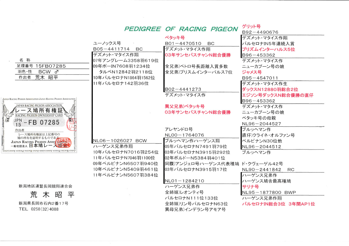 出品鳩♂2番「15FB07285 BCW♂」荒木昭平鳩舎作D・マタイス作翔 バルセロナN1562位ポーIN1234位タルベN2118位(ペタッキ号サンセパスチャンN総合優勝直仔)×ハーゲンス兄弟作翔バルセロナN254位ペルピナンN384位461位(アレヤンドロ号×サリナ号娘)鳩 との直仔です。 父親 "ユーノックス号"「B05−4411714 BC」 D・マタイス鳩舎作翔 バルセロナN1562位ポーIN1234位タルベN2118位鳩で ペタッキ号サンセパスチャンN総合優勝×ペタッキ号異父兄弟鳩の との直仔です。 母親 「NL06−1026027 BCW」ハーゲンス兄弟鳩舎作翔バルセロナN254位ペルピナンN384位461位鳩で アレヤンドロ号(アンジェロ号同腹)バルセロナN79位×サリナ号娘鳩 との直仔です。 詳しくは、添付の血統書の参照をお願いいたします。 <備考> 現在管理人の鳩舎で元気に過ごしています。写真は1/7日に撮影しました。 菅原明鳩舎の概要はこちらをご覧ください |
