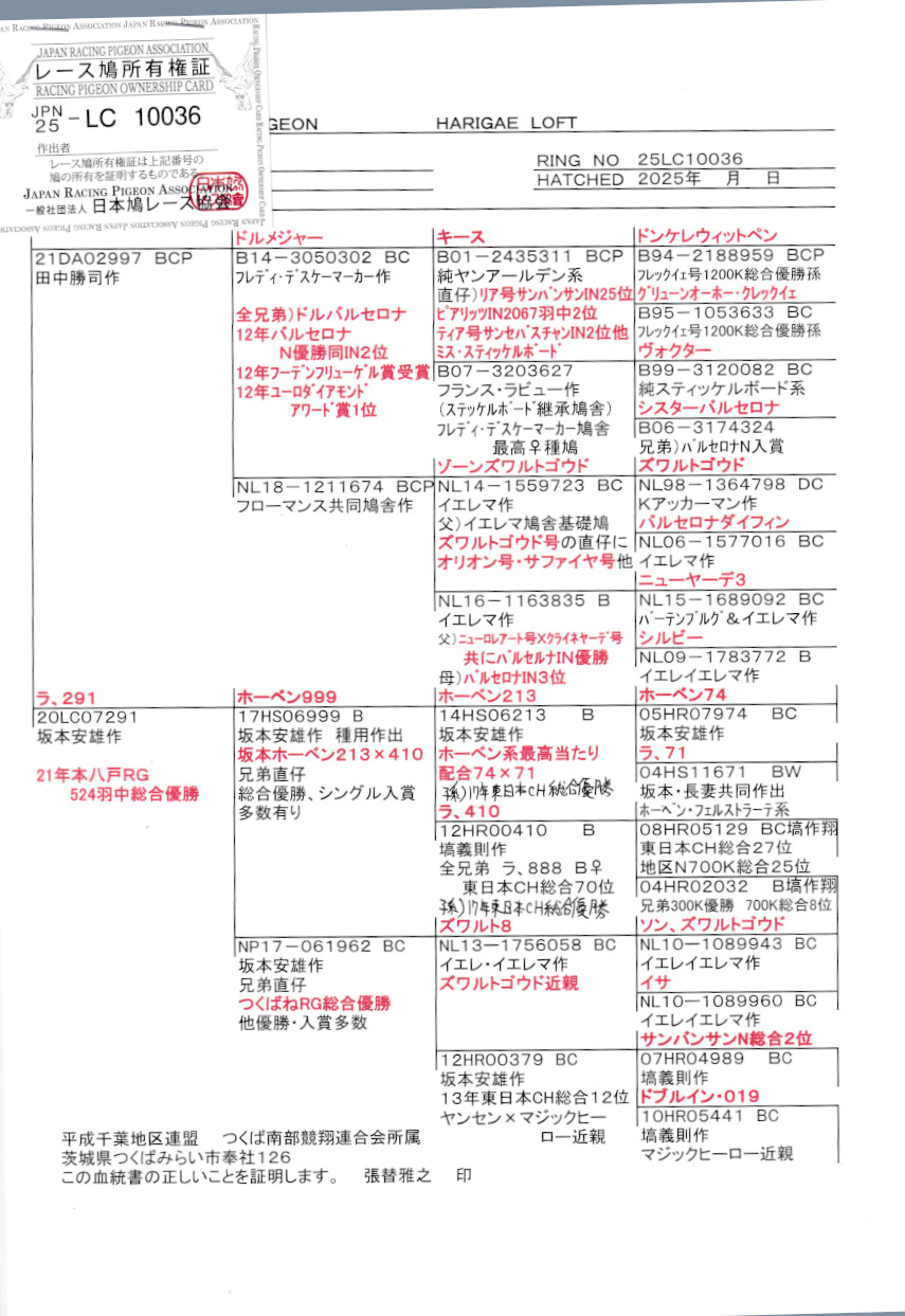 出品鳩若79番「25LC10036 BC」張替雅之鳩舎作田中作(ドルバルセロナ号バルセロナN優勝全兄弟×両親イエレマ作基礎鳩ズワルドゴゥド号孫)直仔×ラ291号21年本八戸春RG524羽総合優勝鳩 との直仔です。 父親 ♂19番「21DA02997 BCW ♂」田中勝司鳩舎作ドルバルセロナ号バルセロナN優勝IN総合2位の全兄弟×両親イエレマ作(基礎鳩ズワルドゴゥド号直仔×シルビー号バルセロナIN3位娘)娘鳩 との直仔です。 母親 ♀12番“ラ291号” 「20LC07291 BC ♀」張替雅之鳩舎作翔 21年本八戸春RG524羽総合優勝鳩 坂本ホーベンスリーナイン号×(イエレマ作ズワルド゜ゴウド孫&イサ号サンバンサンN総合2位直仔×13年東日本CH総合12位)娘鳩 との直仔です。 詳しくは、添付の血統書の参照をお願いいたします。 <備考> 現在管理人の鳩舎で元気に過ごしています。写真は1/11日に撮影しました。 菅原明鳩舎の概要はこちらをご覧ください |