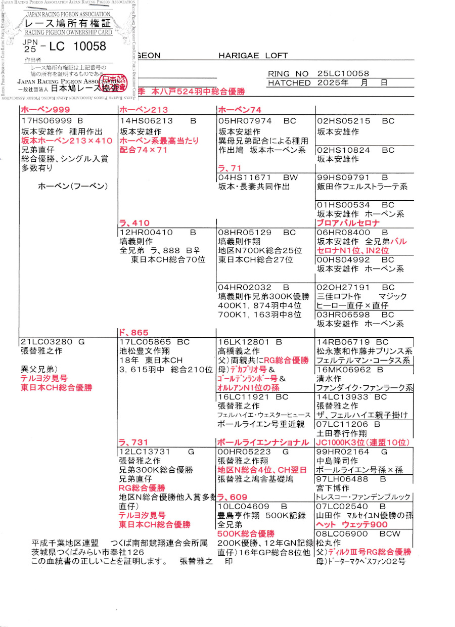 出品鳩若98番「25LC10058 G」張替雅之作半兄弟)本八戸RG総合優勝 ホウベン999号坂本作(孫鳩RGテルヨ汐見号)×テルヨ汐見号CH総合優勝異母兄弟 ![]() |
