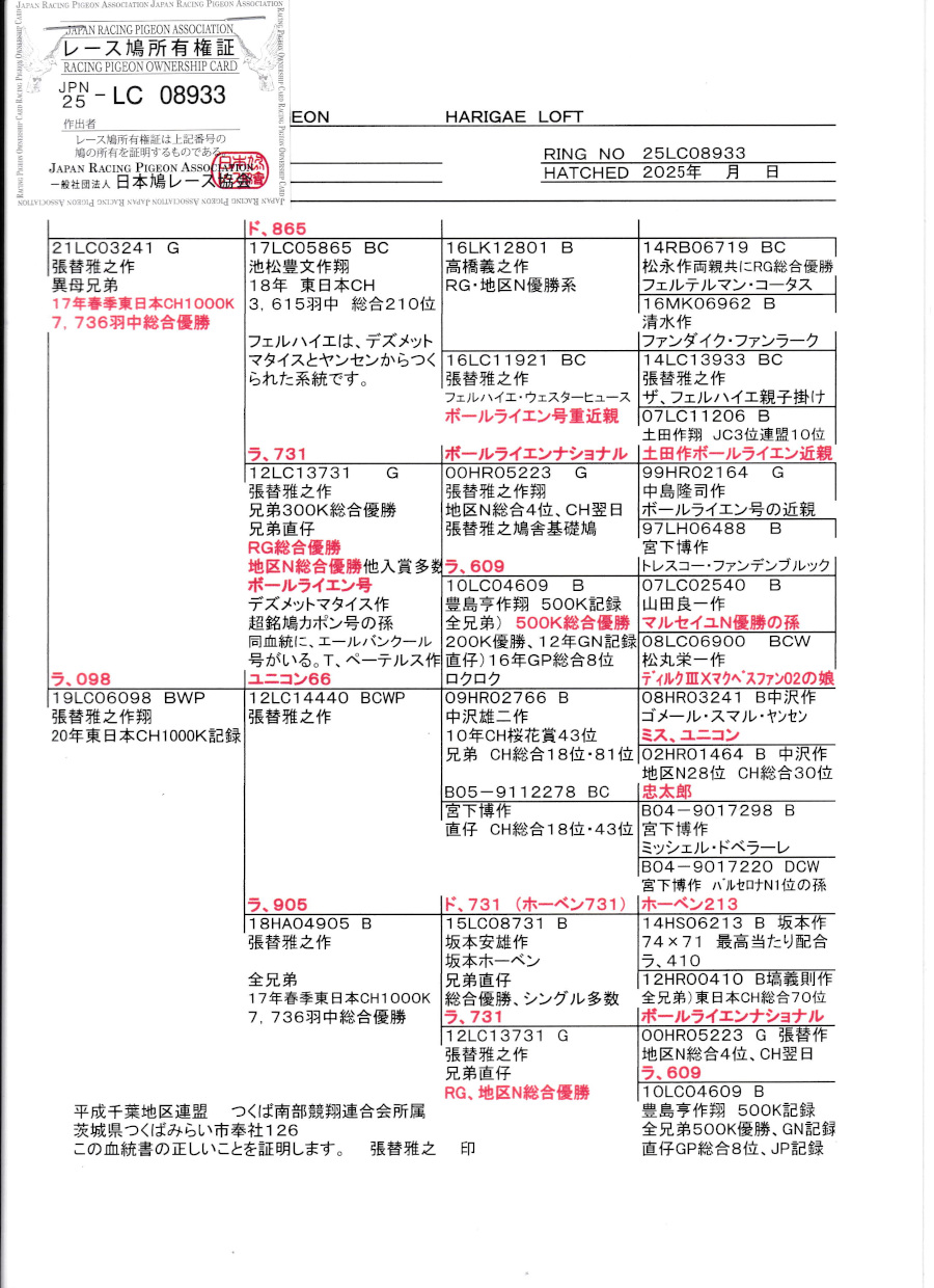 出品鳩若31番「25LC08933 G」張替雅之鳩舎作テルヨ汐見号 東日本CH7736羽総合優勝異母兄弟&ド865号池松作翔18年東日本CH3615羽総合210位直仔×ラ098号21年東日本CH帰還鳩(ユニコン440号×ラ905号)との直仔です。 父親 「21LC03241 G」張替雅之鳩舎作 異母兄弟にテルヨ汐見号 東日本CH7736羽総合優勝鳩がいる ド865号池松作翔18年東日本CH3615羽総合210位鳩×ラ731号基礎鳩ボールライエンナショナル号地区N総合4位の娘鳩 との直仔です。 母親 "ラ098号"♀9番 「19LC06098 BW ♀」張替雅之鳩舎作翔21年東日本CH帰還鳩 異母兄弟に東日本CH総合77位 25年東日本CH連盟14位鳩がいる ユニコン440号×ラ905号(テルヨ汐見号東日本CH7736羽総合優勝全兄弟)との直仔です。 詳しくは、添付の血統書の参照をお願いいたします。 <備考> 現在管理人の鳩舎で元気に過ごしています。写真は1/11日に撮影しました。 菅原明鳩舎の概要はこちらをご覧ください |