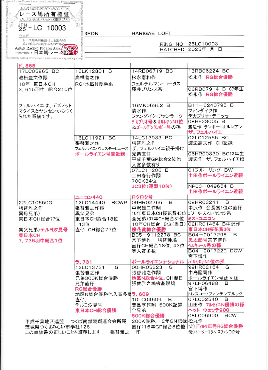 出品鳩若57番「25LC10003 WG」張替雅之鳩舎作ド865号池松作翔18年東日本CH3615羽総合210位鳩 ×テルヨ汐見号 東日本CH7736羽総合優勝の異父兄弟鳩 との直仔です。 父親 "ド865号"「17LC05865 BC」池松豊文鳩舎作翔 18年東日本CH3615羽総合210位鳩で(藤井輸入系RG総合優勝ペァー直仔Xデカプリオ号&ゴールデンランボー号の孫)直仔X(ザ・フェルハイエオ号直仔×ボールライエン近親JC連盟3位)娘鳩 との直仔です。 母親 ♀22番 「22LC10650 G ♀」張替雅之鳩舎作異母兄弟にテルヨ汐見号 東日本CH7736羽総合優勝鳩 東日本CH総合787位鳩がいる ユニコン440号(中沢作翔ロクロク号桜花賞43位直仔×ラ731号基礎鳩ボールライエンナショナル号地区N総合4位孫鳩 との直仔です。 詳しくは、添付の血統書の参照をお願いいたします。 <備考> 現在管理人の鳩舎で元気に過ごしています。写真は1/11日に撮影しました。 菅原明鳩舎の概要はこちらをご覧ください |