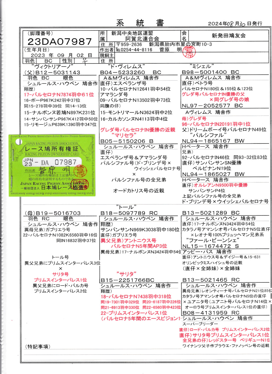 出品鳩♀24番「23DA07987 BC ♀」菅原 明鳩舎作両親ハウベン作ヴィクトリアーノ号17年バルセロナN7874羽61位×サリタ号22年プリズムインターパルス第一位(バルセロナIN5年間)の娘鳩 との直仔です。 父親 “ヴィクトリアーノ号”「B12−5031143 BC」シュルールスハウベン鳩舎作翔 17年バルセロナN7874羽61位ポーP13位39位37位ナルボンヌ若N231位 全兄弟にバルセロナN54位鳩N73位鳩がいる ド・ヴィレムス号×マリセラ号との直仔です。 母親 「B19−5016703 RC」シュルールスハウベン鳩舎作 異母兄弟にガブリエラ号バルセロナN16位鳩がいる トール号プリズムインターバルス3位の異父兄弟×サリタ号22年プリズムインターパルス第一位(バルセロナIN5年間)鳩 との直仔です。 詳しくは、添付の血統書の参照をお願いいたします。 <備考> 現在管理人の鳩舎で元気に過ごしています。写真は1/11日に撮影しました。 菅原明鳩舎の概要はこちらをご覧ください |
