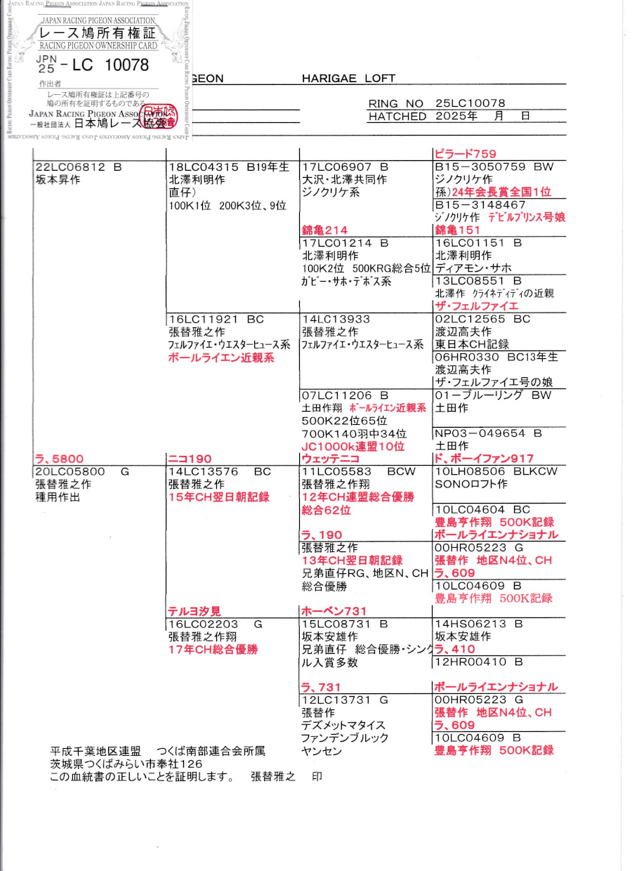 出品鳩若109番 「25LC10078 B」張替雅之鳩舎作半兄弟に24年東日本CH帰還鳩 坂本作錦亀214号RG総合3位孫×テルヨ汐見号東日本CH7736羽総合優勝の娘鳩との直仔です。 父親 ♂25番 "ド812号"「22LC06812 B ♂」坂本 昇鳩舎作 直仔に24年東日本CH1000K帰還鳩がいる 北澤作 (両親ジノクリケ作デビルプリンスの孫X錦亀214号RG総合3位)直仔X(ザ・フェルハイエ号直仔×土田作翔ボールライエン近親系700k33位JC3位連盟10位)娘鳩 との直仔です。 母親 "ラ5800号"「20LC05800 G」張替雅之鳩舎作 (東日本CH連盟優勝総合62位XCH翌朝記録鳩&基礎鳩ボールライエンナショナル号の娘)直仔Xテルヨ汐見号17年東日本CH総合優勝鳩 との直仔です。 詳しくは、添付の血統書の参照をお願いいたします。 <備考> 現在管理人の鳩舎で元気に過ごしています。写真は1/11日に撮影しました。 菅原明鳩舎の概要はこちらをご覧ください |