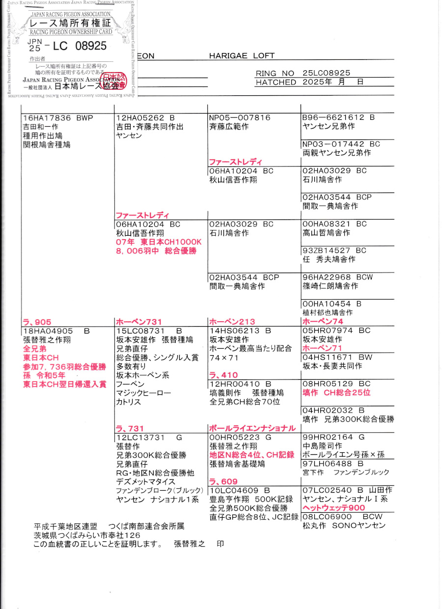 出品鳩若26番「25LC08925 BC」張替雅之作吉田作(ファストレディ号東日本CH総合優勝×息子)交配直仔×テルヨ汐見号東日本CH総合優勝全兄弟 ![]() |