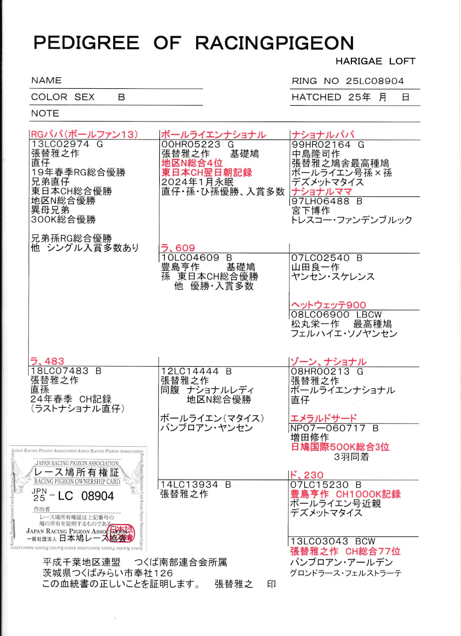 出品鳩若10番 「25LC08904 B」張替雅之鳩舎作異母兄弟に19年沼宮内RG2549羽総合優勝鳩がいる ボールライエンファン13号(基礎鳩ボールエンナショナル号直仔)×ラ483号(地区N総合優勝の同腹&基礎鳩ボールライエンナショナル号孫鳩×東日本CH総合77位の娘)娘鳩 との直仔です。 父親 "ボールライエンファン13"「13LC02974 G」張替雅之鳩舎作 直仔に19年春RG総合優勝 兄弟直仔に東日本CH総合優勝地区N総合優勝鳩がいる 基礎鳩ボールエンナショナル号地区N総合4位×ラ609号 との直仔です。 母親 ♀5番"ラ483号"「18LC07483 B」張替雅之鳩舎作 地区N総合優勝の同腹(基礎鳩ボールライエンナショナル号孫鳩) ×(東日本CH1000K×東日本CH総合77位)娘鳩 との直仔です。 詳しくは、添付の血統書の参照をお願いいたします。 <備考> 現在管理人の鳩舎で元気に過ごしています。写真は1/11日に撮影しました。 菅原明鳩舎の概要はこちらをご覧ください |