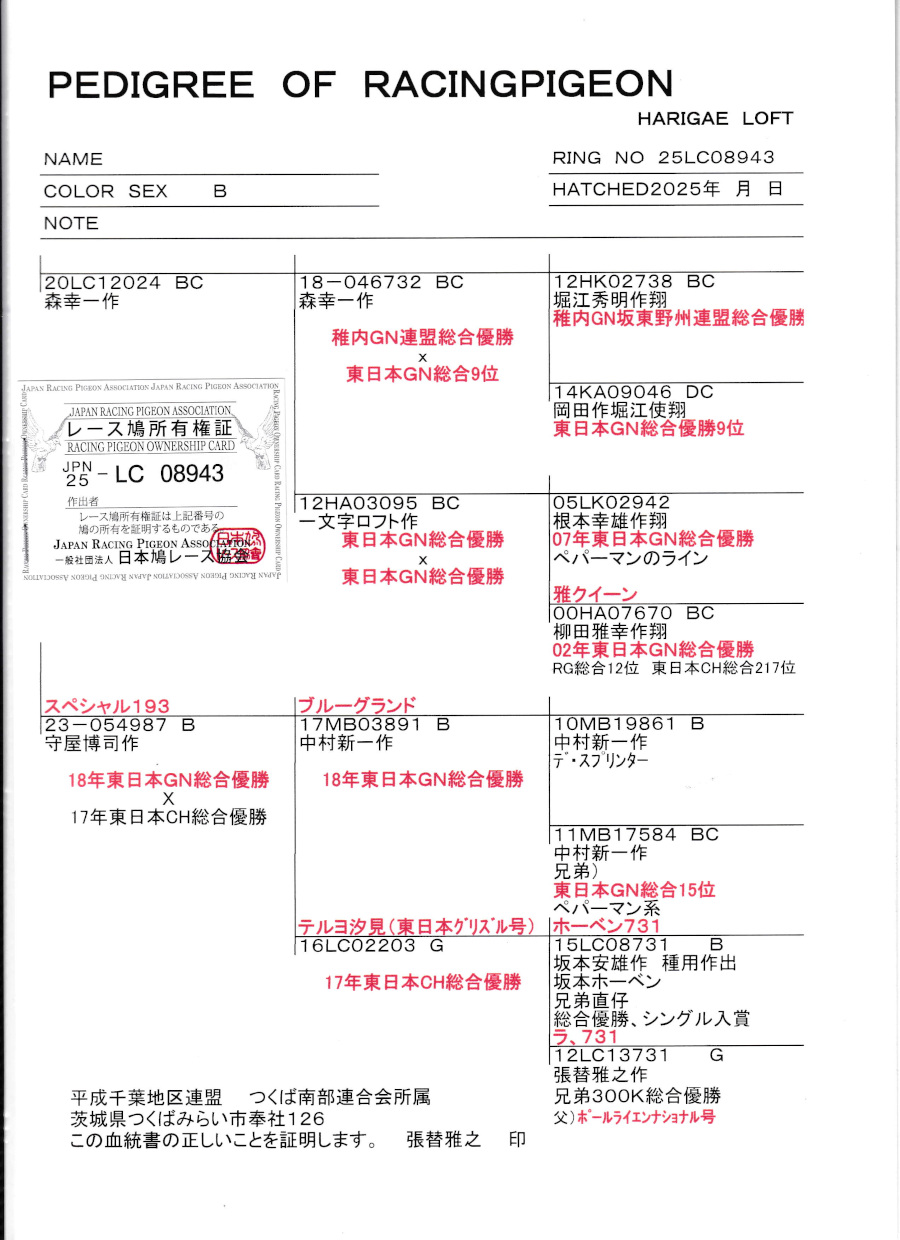 出品鳩若40番「25LC08943 B」張替雅之鳩舎作(両親堀江翔作GN連盟優勝&GN連盟優勝総合9位直仔X根本作GN総合優勝&柳田作GN総合優勝の娘)直仔×守屋作(ブルーグランド号東日本GN総合優勝×テルヨ汐見号東日本CH総合優勝)娘鳩 との直仔です。 父親 「20LC12024 BC」森 幸一鳩舎作両親堀江翔(稚内GN連盟優勝×東日本GN連盟優勝総合9位)直仔X一文字作(根本作東日本GN総合優勝×柳田作東日本GN総合優勝)娘鳩 との直仔です。 母親 ♀23番 "スペシャル193号"「23−054987 B ♀」守屋博司鳩舎作ブルーグランド号東日本GN1100k1781羽中総合優勝×テルヨ汐見号東日本CH7736羽総合優勝鳩同士の直仔です。 詳しくは、添付の血統書の参照をお願いいたします。 <備考> 現在管理人の鳩舎で元気に過ごしています。写真は1/11日に撮影しました。 菅原明鳩舎の概要はこちらをご覧ください |