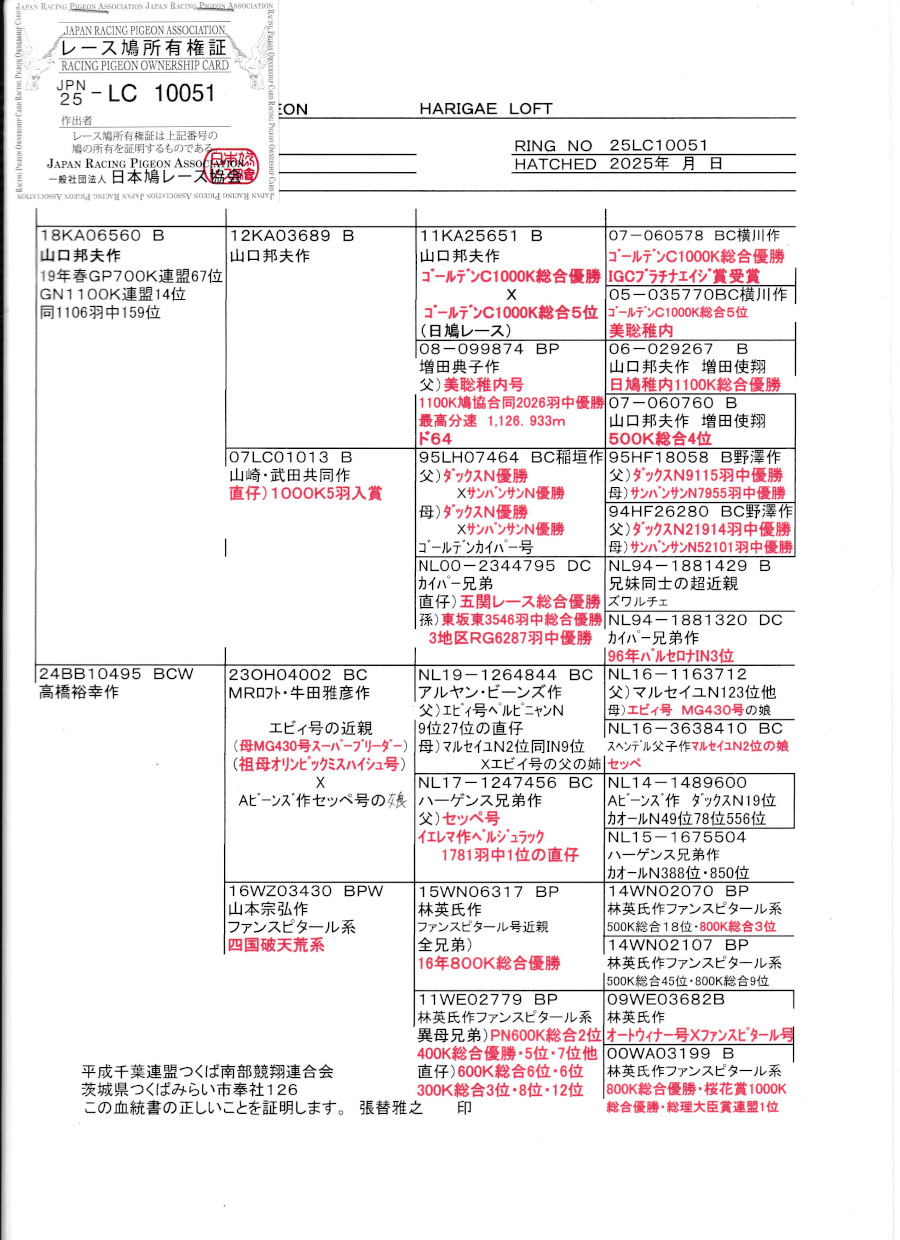 出品鳩若93番「25LC10051 BC」張替雅之作山口作翔GP総合67位GN連盟14位総合159位×高橋作(セッペ号ダツクスN19位孫×両親林作ファンスタピタール系) ![]() |