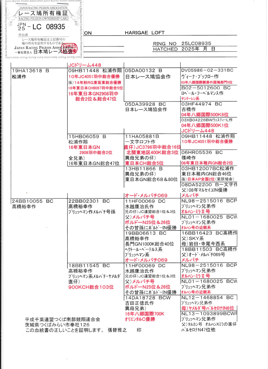 出品鳩若33番「25LC08935 B」張替雅之作松浦作(JC総合優勝XGN総合2位)×高橋作CH総合103位半兄弟(水越作メルバチ号直仔&オードメルバチ069号直仔×娘) ![]() |